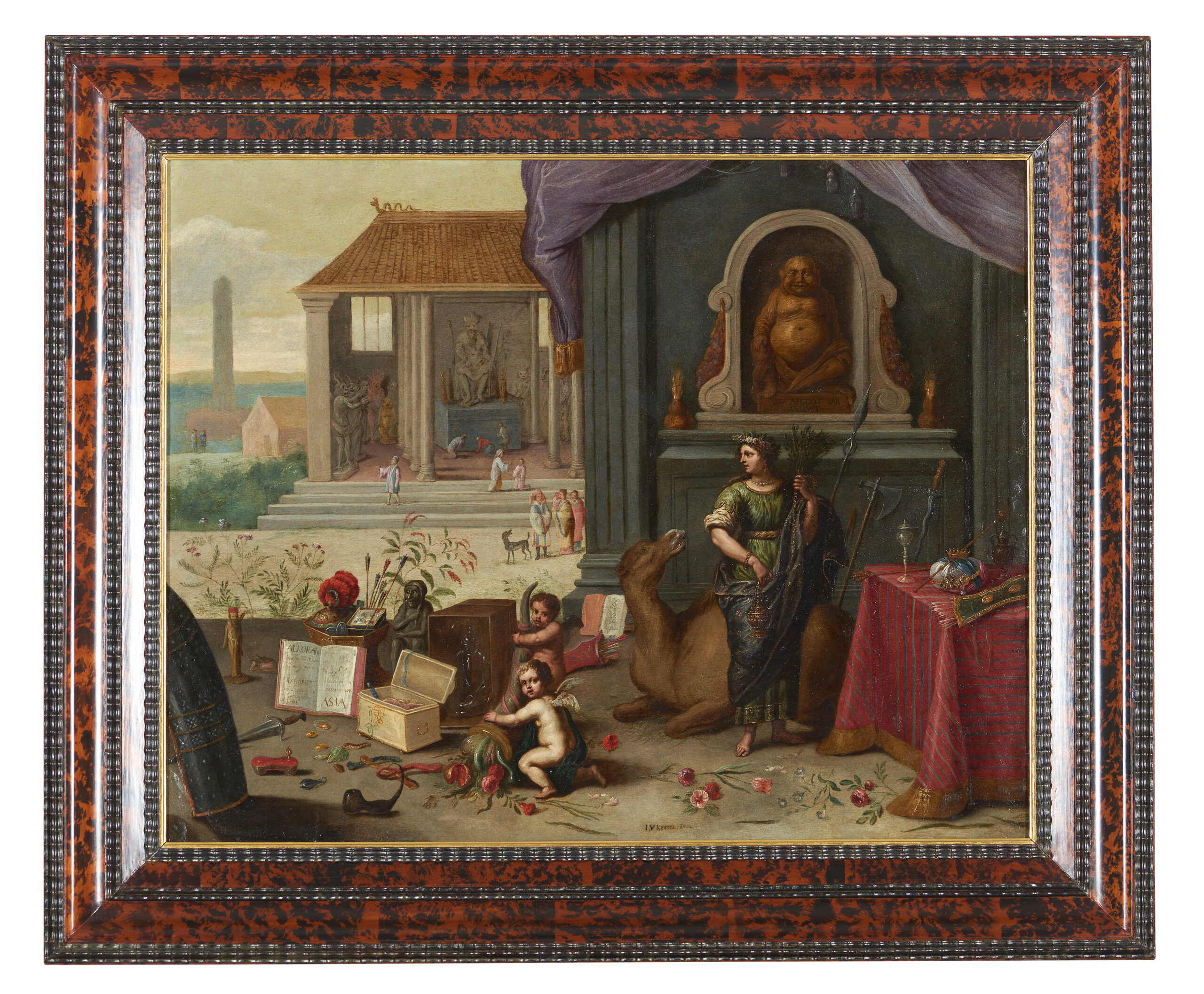 Ásia apresenta uma mulher ricamente trajada segurando um turíbulo (incensário), coroada com uma grinalda de flores. Está diante de um camelo ajoelhado, à esquerda de uma mesa onde se encontram um turbante coroado e um ceptro, alguns recipientes e uma aljava. Atrás dela, num nicho, há um grande Buda, com armas exóticas apoiadas. Em primeiro plano, ao centro, dois querubins viram uma cornucópia junto de um conjunto de objectos exóticos e bens preciosos, incluindo bichos-da-seda. Um livro aberto tem, no canto inferior esquerdo, a inscrição “ASIA” e, no canto superior direito, “ALKORAN”, e mais abaixo “MAHOMETE”, numa referência ao Islão.(6) Na extrema esquerda encontra-se o que provavelmente é um grande escudo, com uma espada por detrás. Ao fundo, à esquerda, há um templo com figuras a adorar ídolos. Mais ao longe, no extremo esquerdo, vê-se o que poderá ser uma torre ou um obelisco.