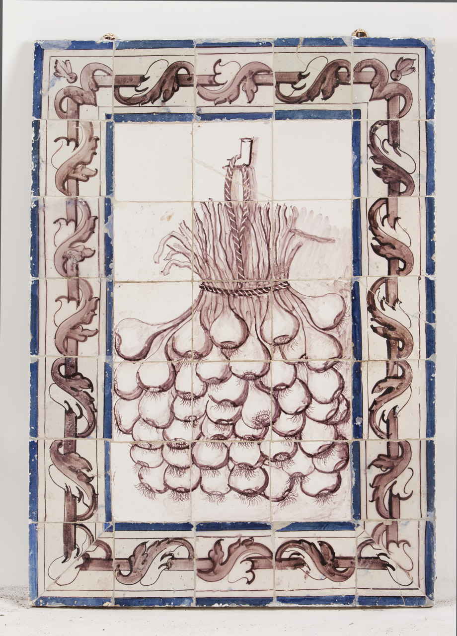 Cercadura a vinoso e azul e interior a vinoso representando molho de alhos