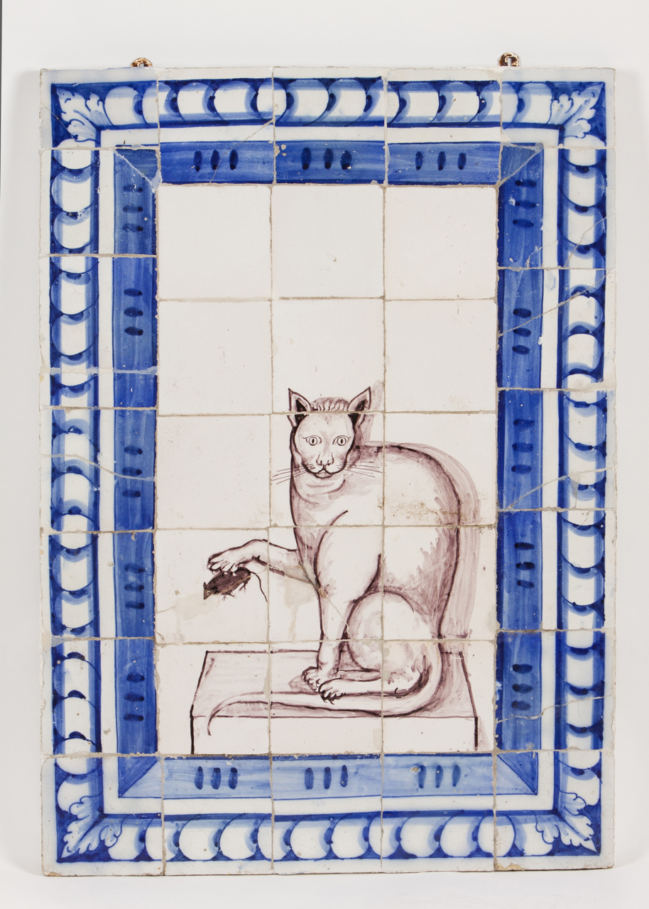 Cercadura a azul e interior a vinoso representando gato e rato