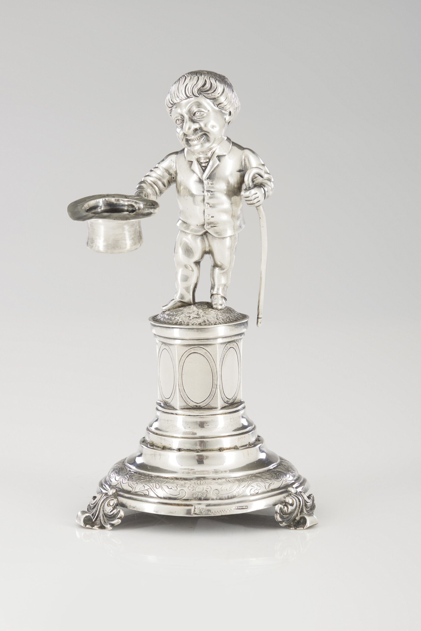 Escultura representando figura de cabeçudo a segurar uma cartola e uma bengala