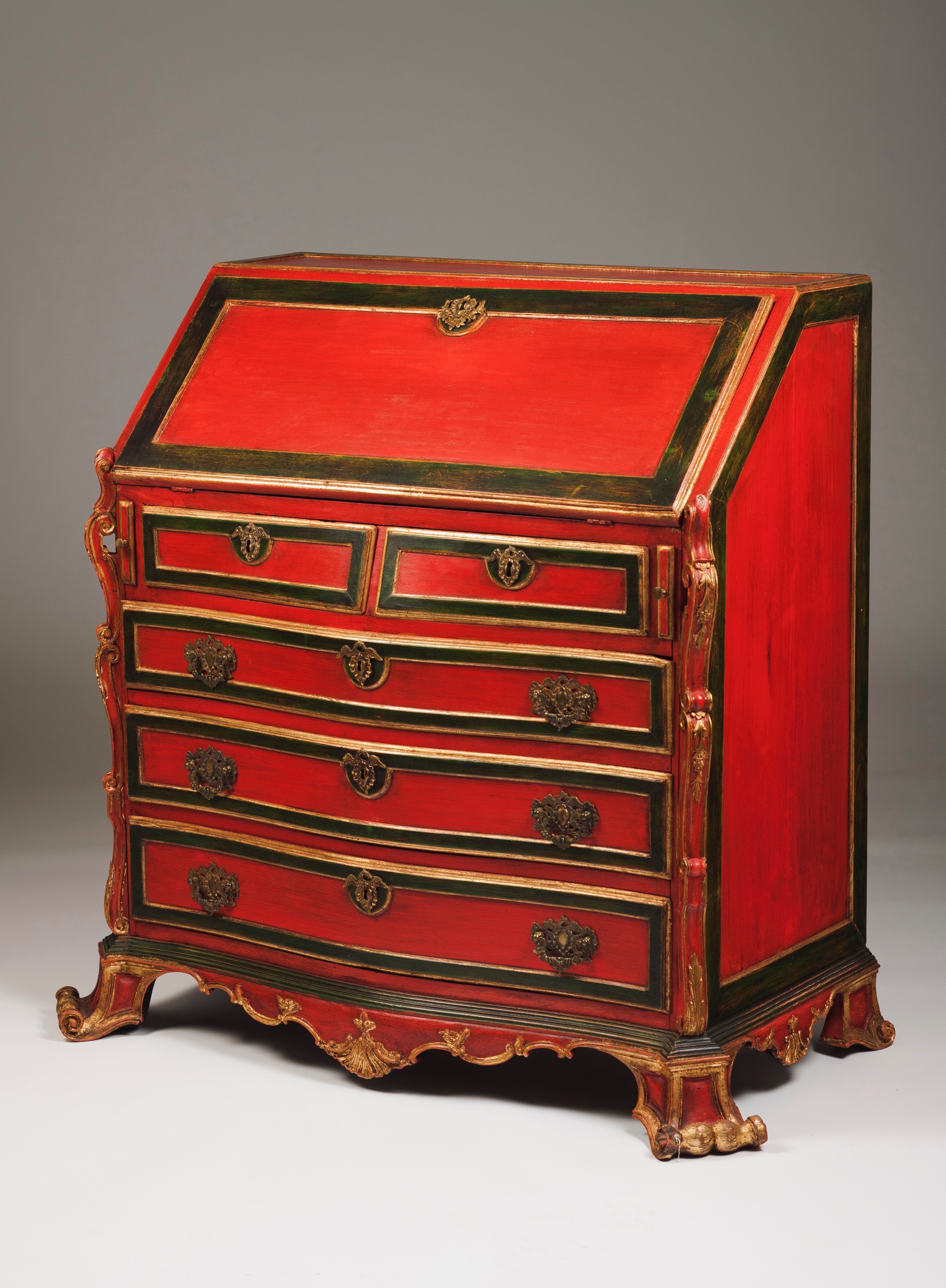 Cantos dianteiros decorados com pilastras de enrolamentos vegetalistas e volutas desenvolvendo-se no sentido descendente até formarem pés elevados em forma de enrolamentos
