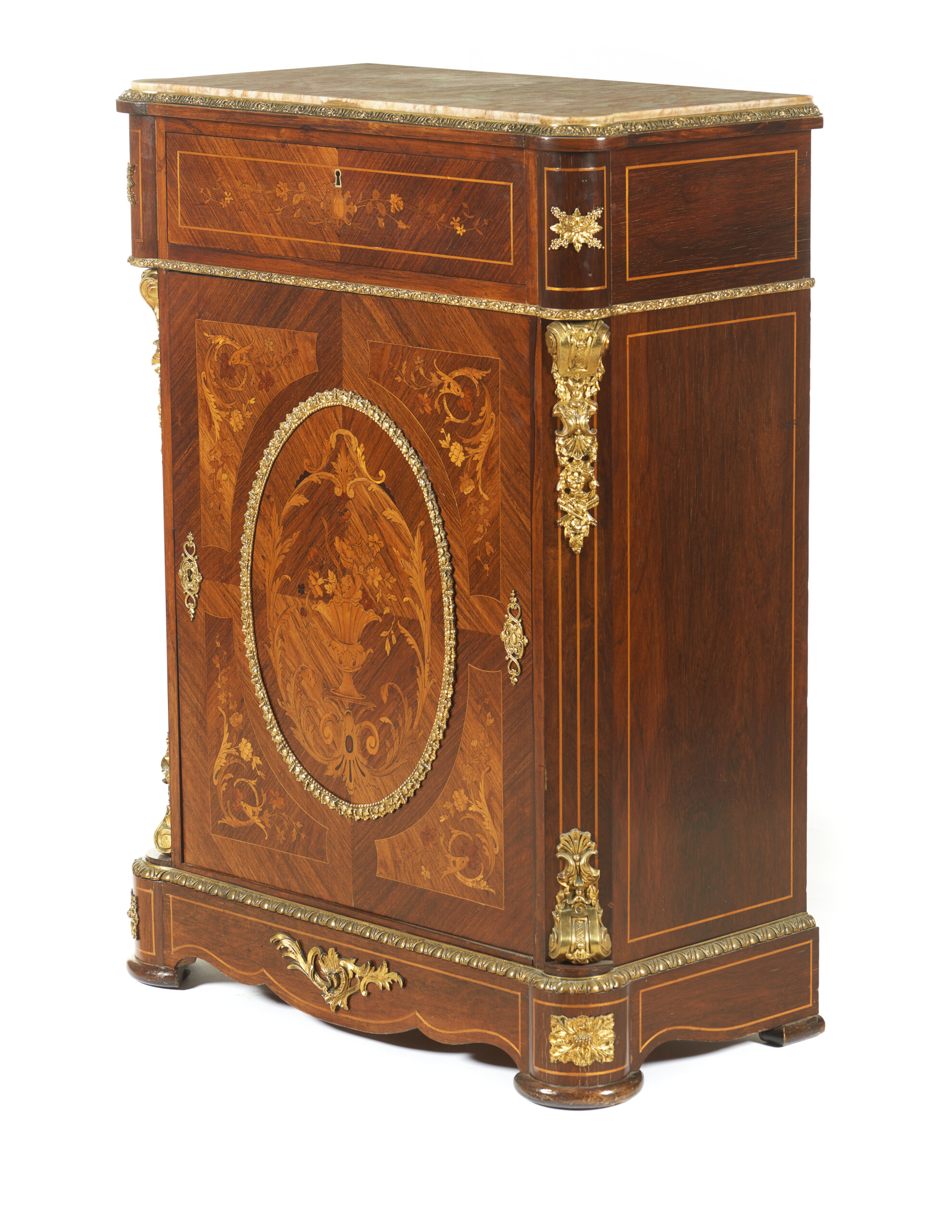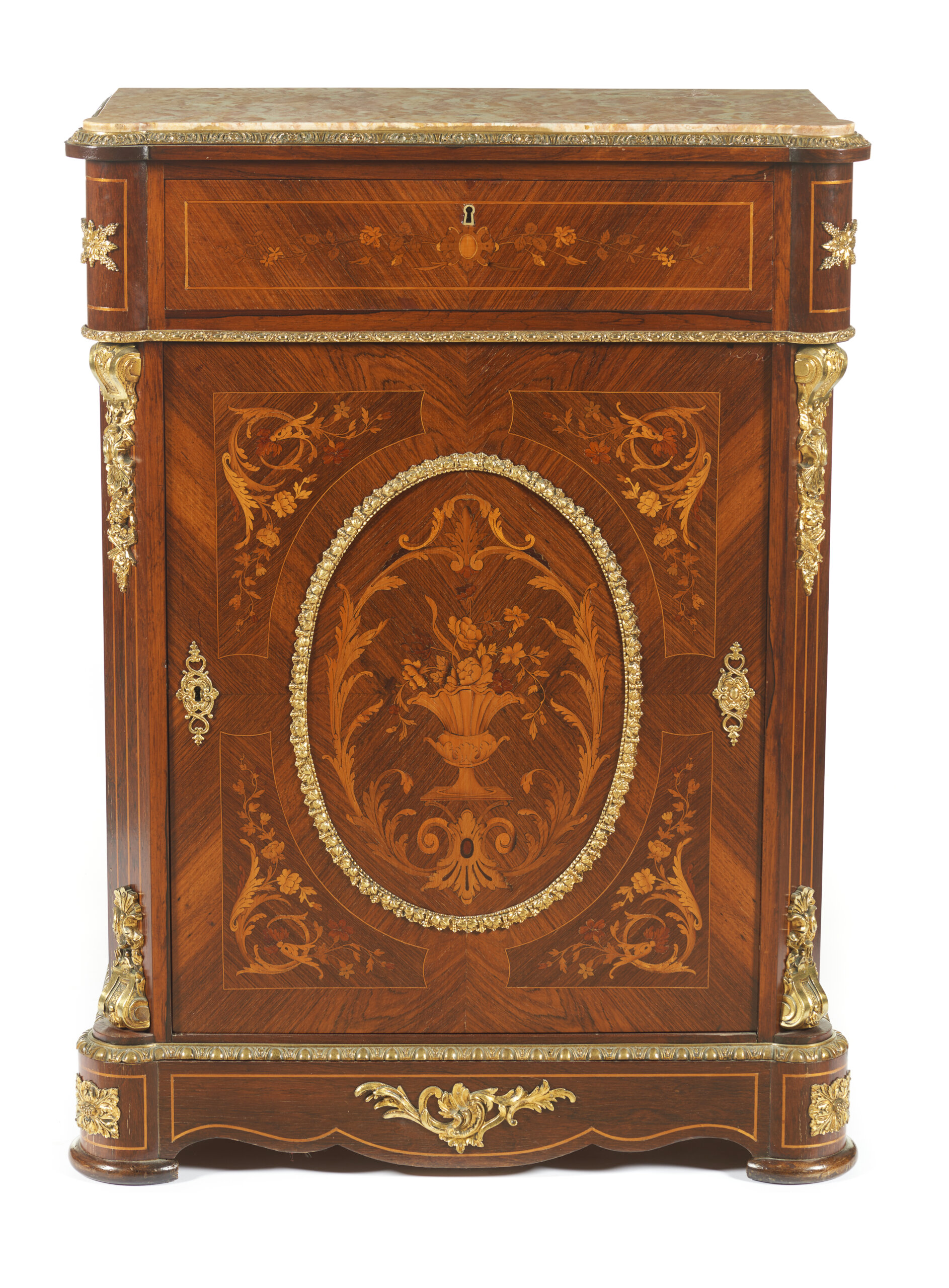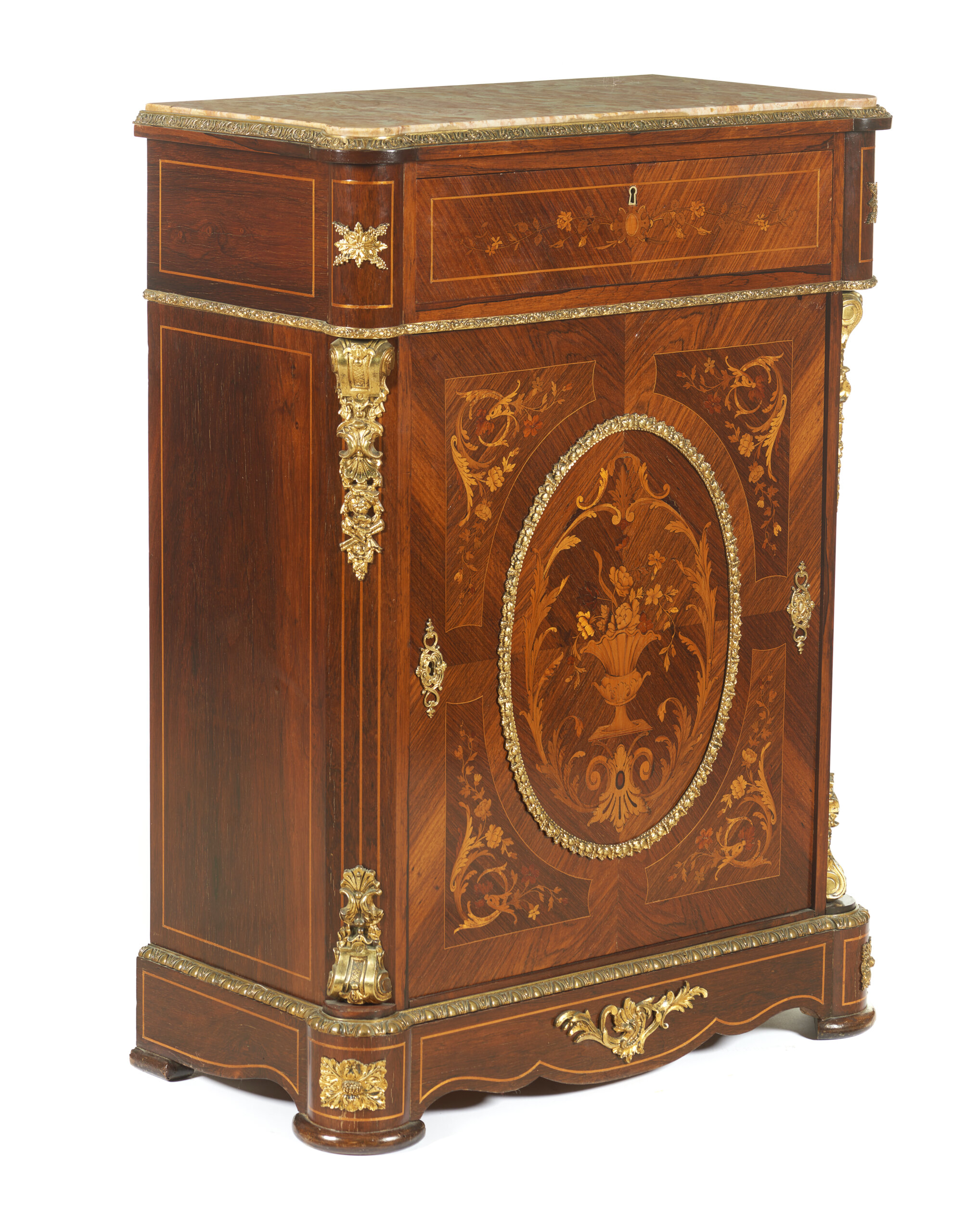 Faixeados a pau-santo, com trabalho de marchetaria em pau-santo e pau-cetim representando jarras com flores e outros motivos vegetalistas