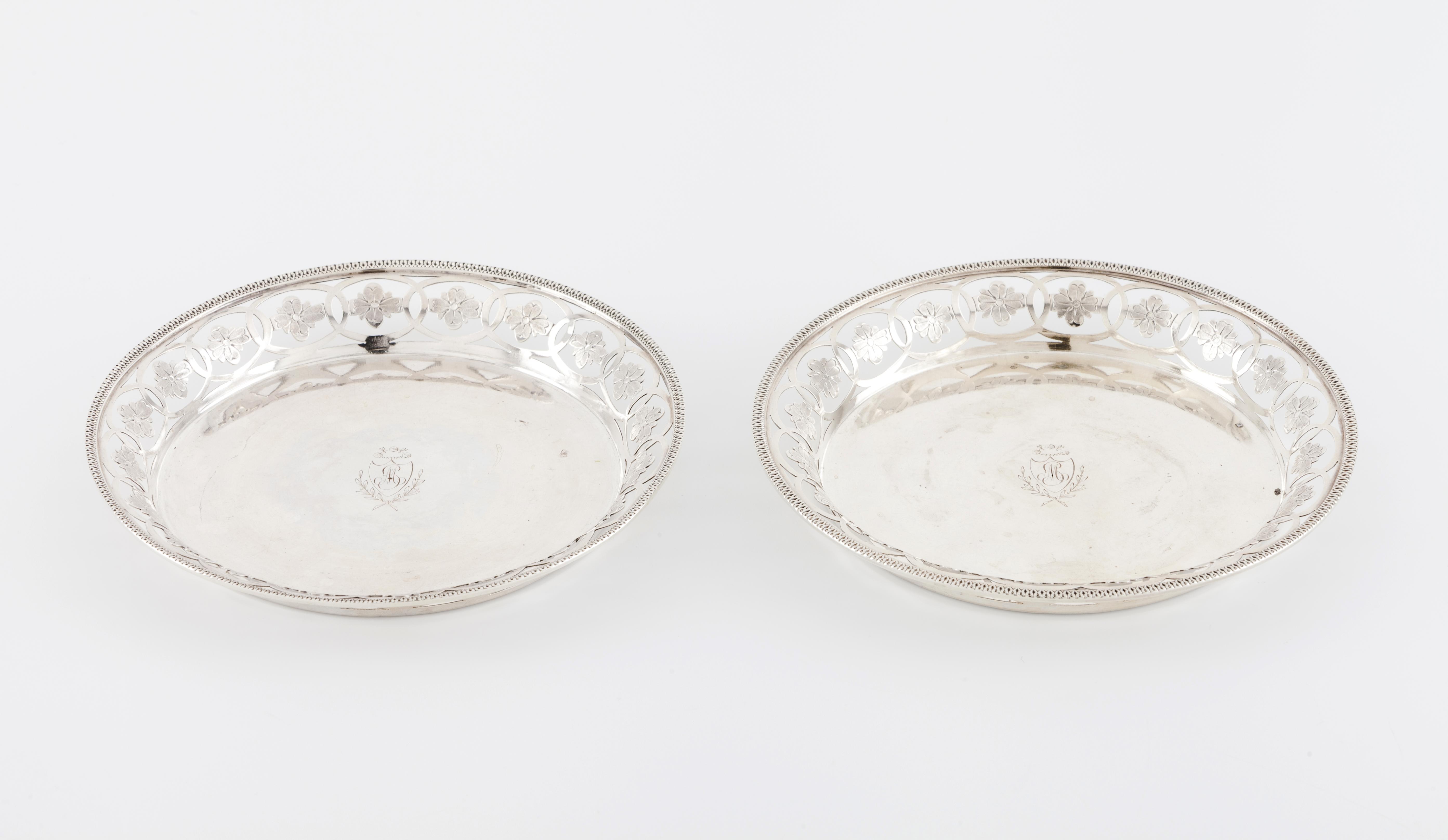 Decoração de quadrifólios e ovais, o centro gravado com monograma em formato de escudo emoldurado por coroa de ramos de louro e flores de laranjeira em alusão a pureza e fertilidade