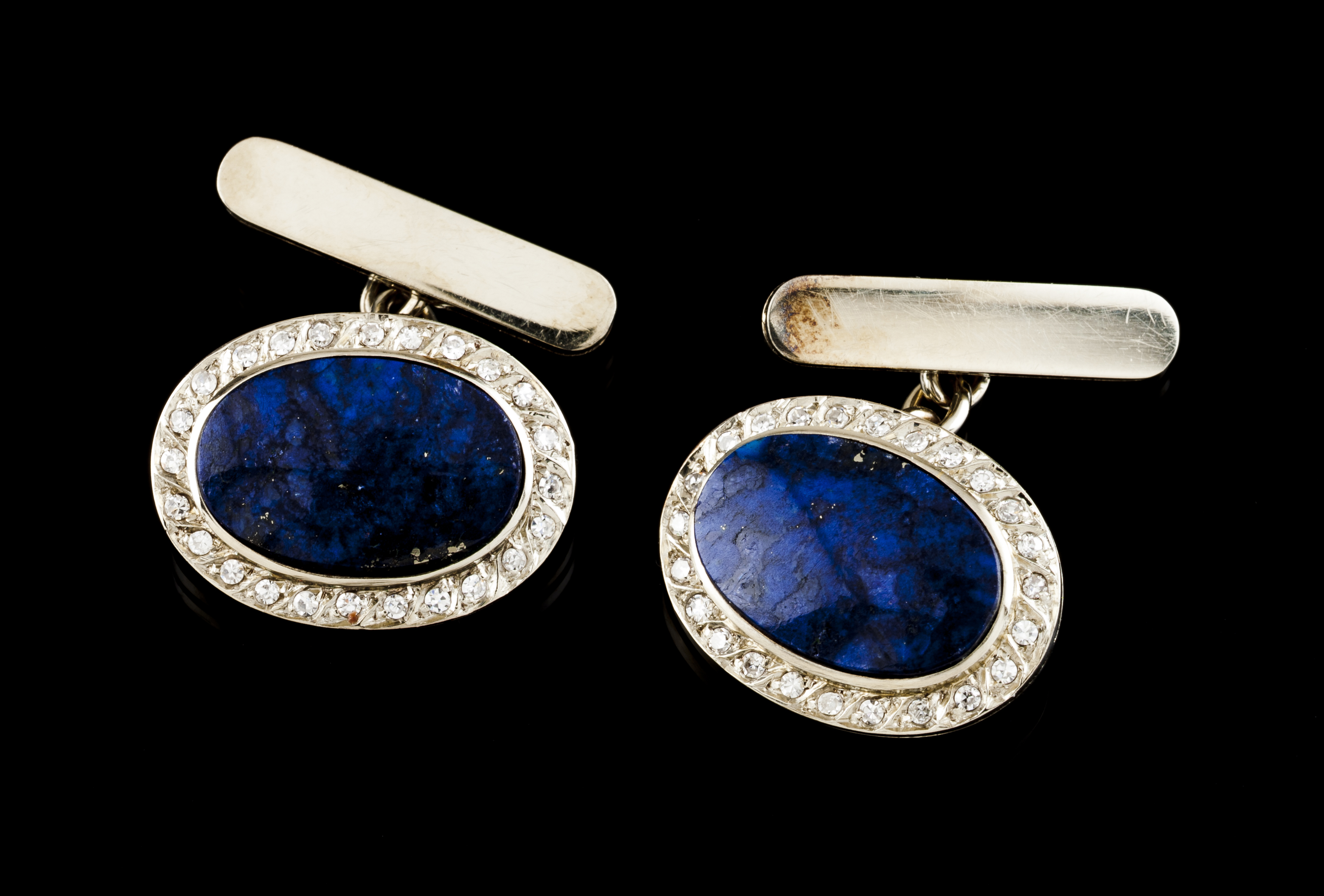 Cravejados com 2 placas de lápis-lazúli e 48 diamantes em talhe 8/8 com o peso aproximado de 0,50 ct.