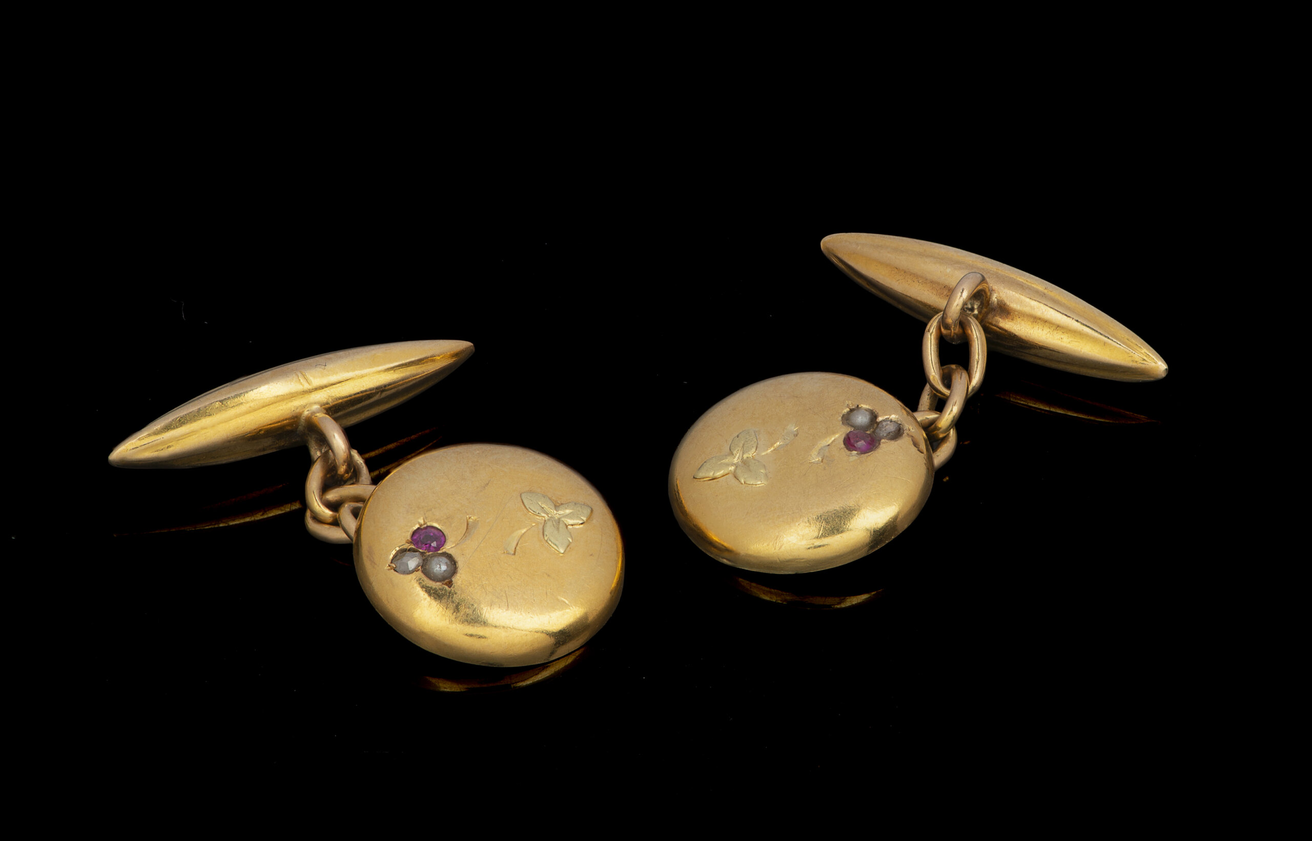 Cravejado com rubis, 1/2 pérolas e 2 diamantes em talhe rosa