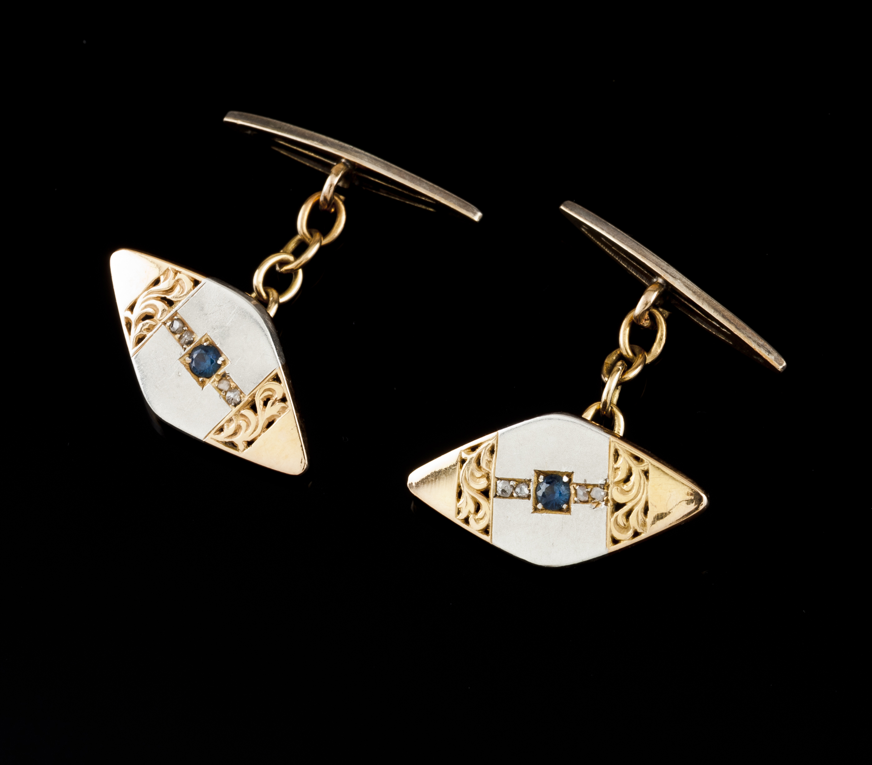 Em formato de losângulo com decoração vazada vegetalista cravejados com 2 pequenas safiras e 8 diamantes em talhe rosa.