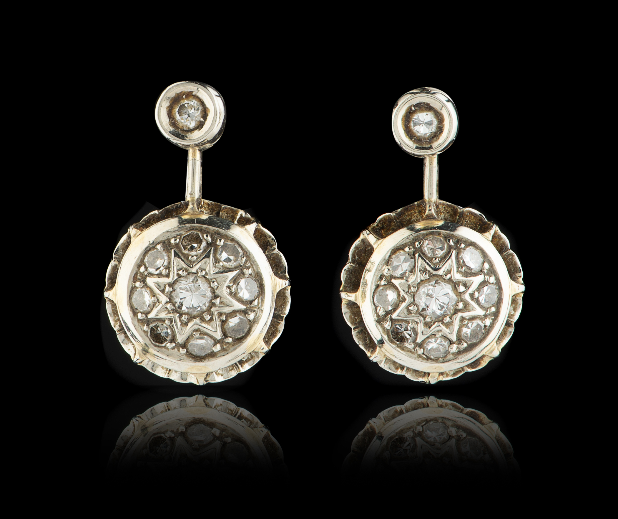 Cravejados com 16 diamantes em talhe 8/8 e 4 em talhe de brilhante com o peso total aproximado de 0,60 ct.