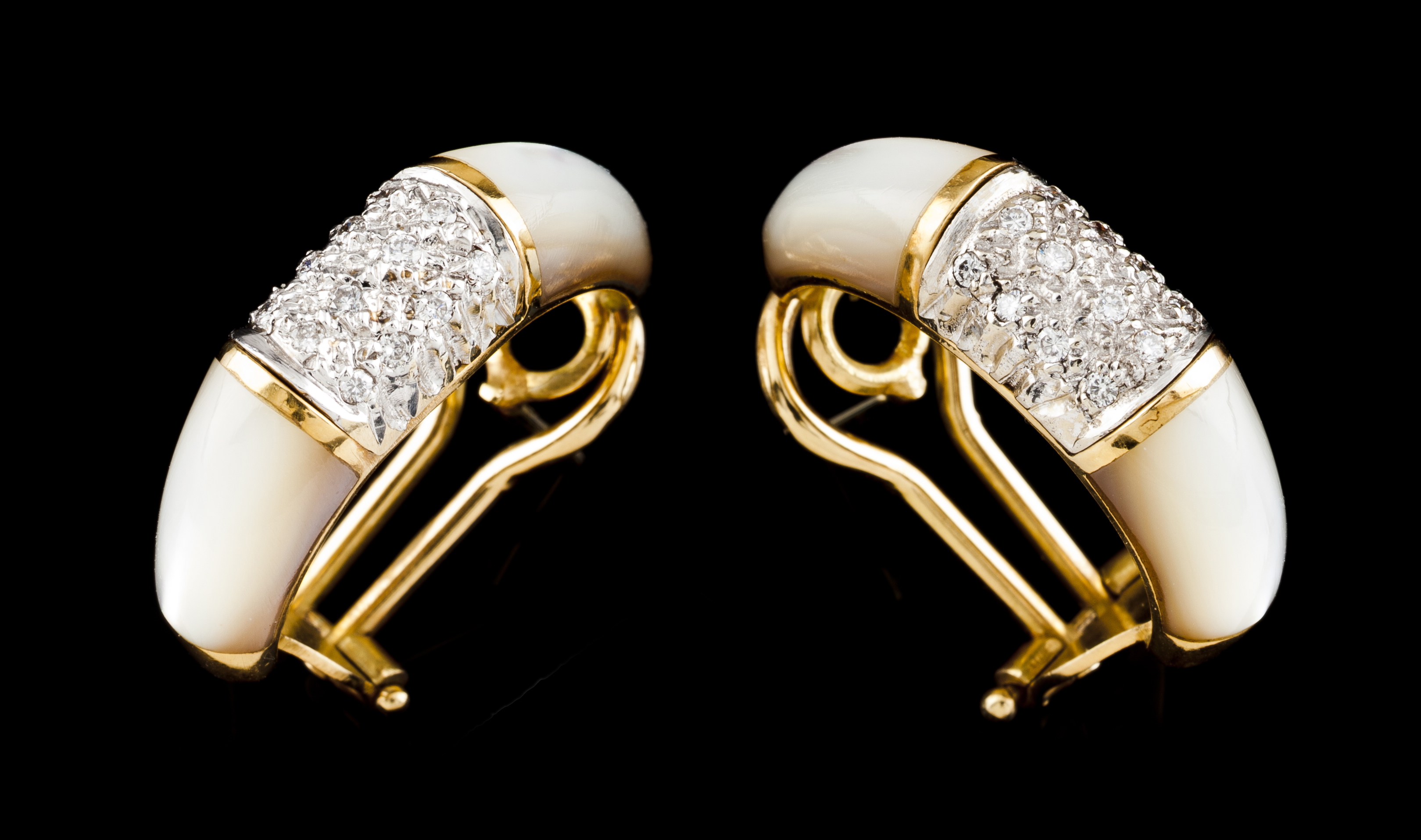 Aplicação de placas de madrepérola e cravejados com 24 diamantes em talhe de brilhante com o peso aproximado de 0,24 ct.