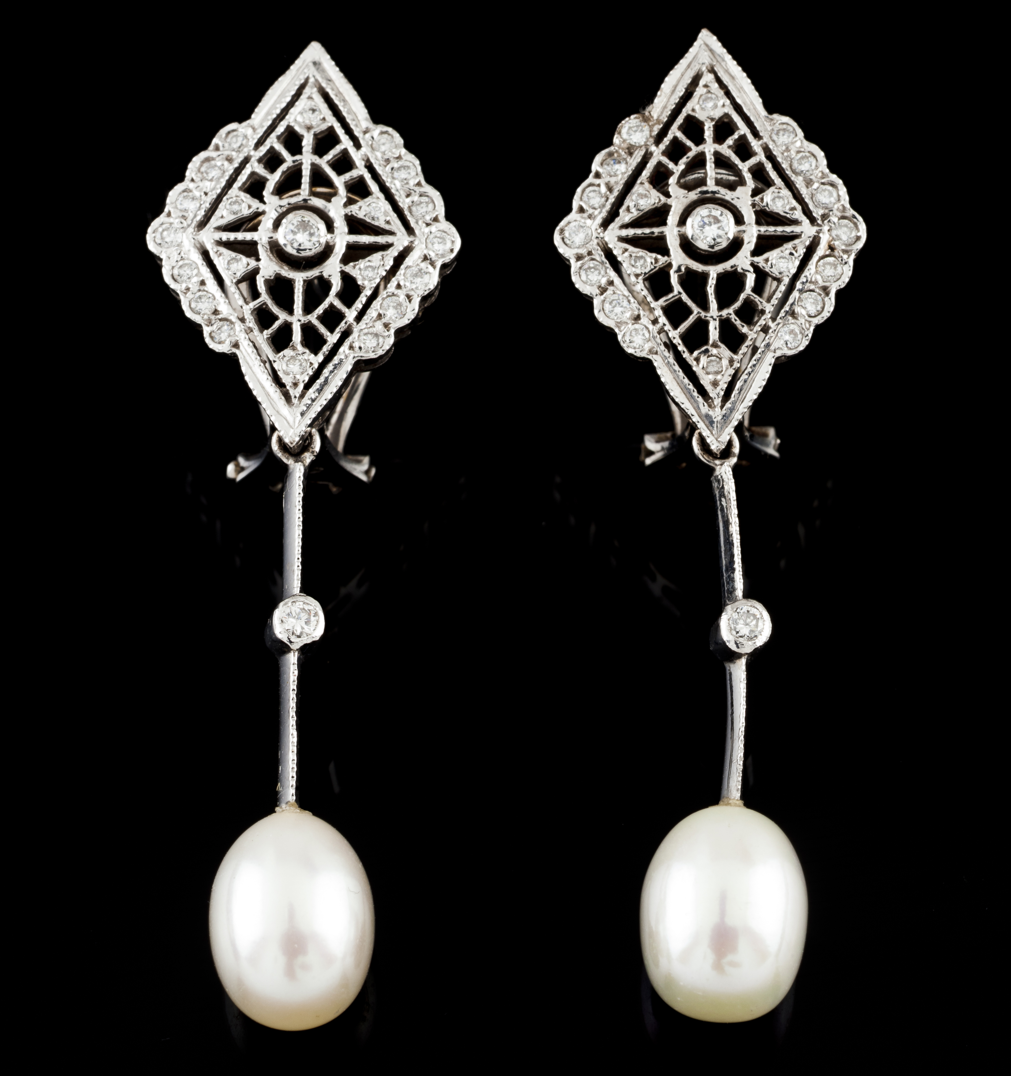 Topo em losângulo rendilhado cravejado com pequenos diamantes com pérola oval de água doce pendente
