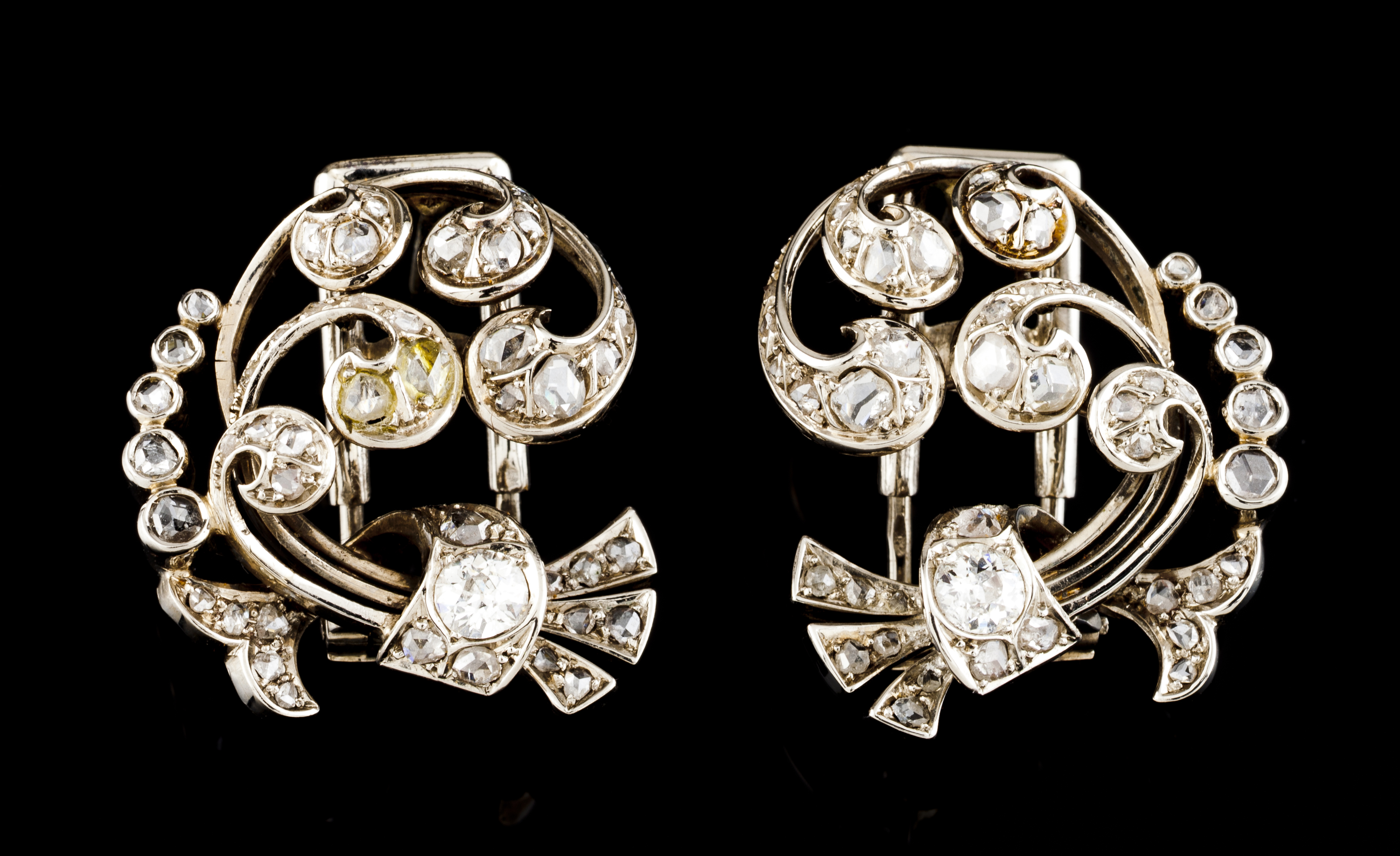 Cravejados com diamantes em talhe rosa e talhe rosa coroado e 2 diamantes em talhe antigo de brilhante com o peso aproximado de 0,50 ct.