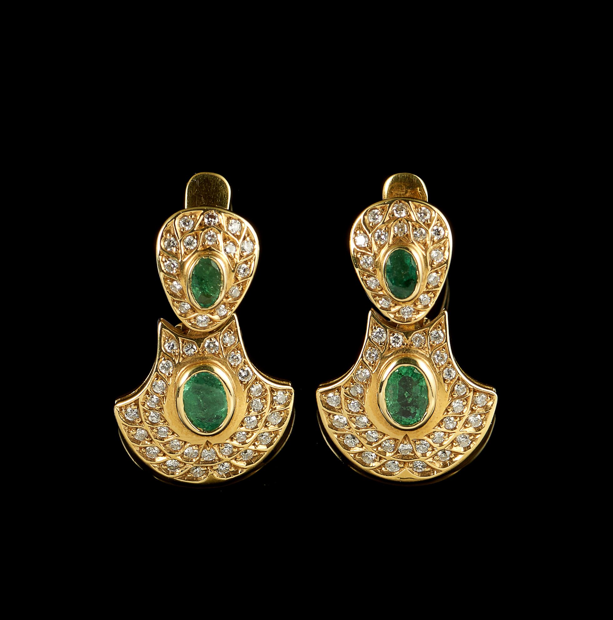 Cravejado com 4 esmeraldas em talhe oval e 88 diamantes em talhe de brilhante com o peso aproximado de 1,76 ct.