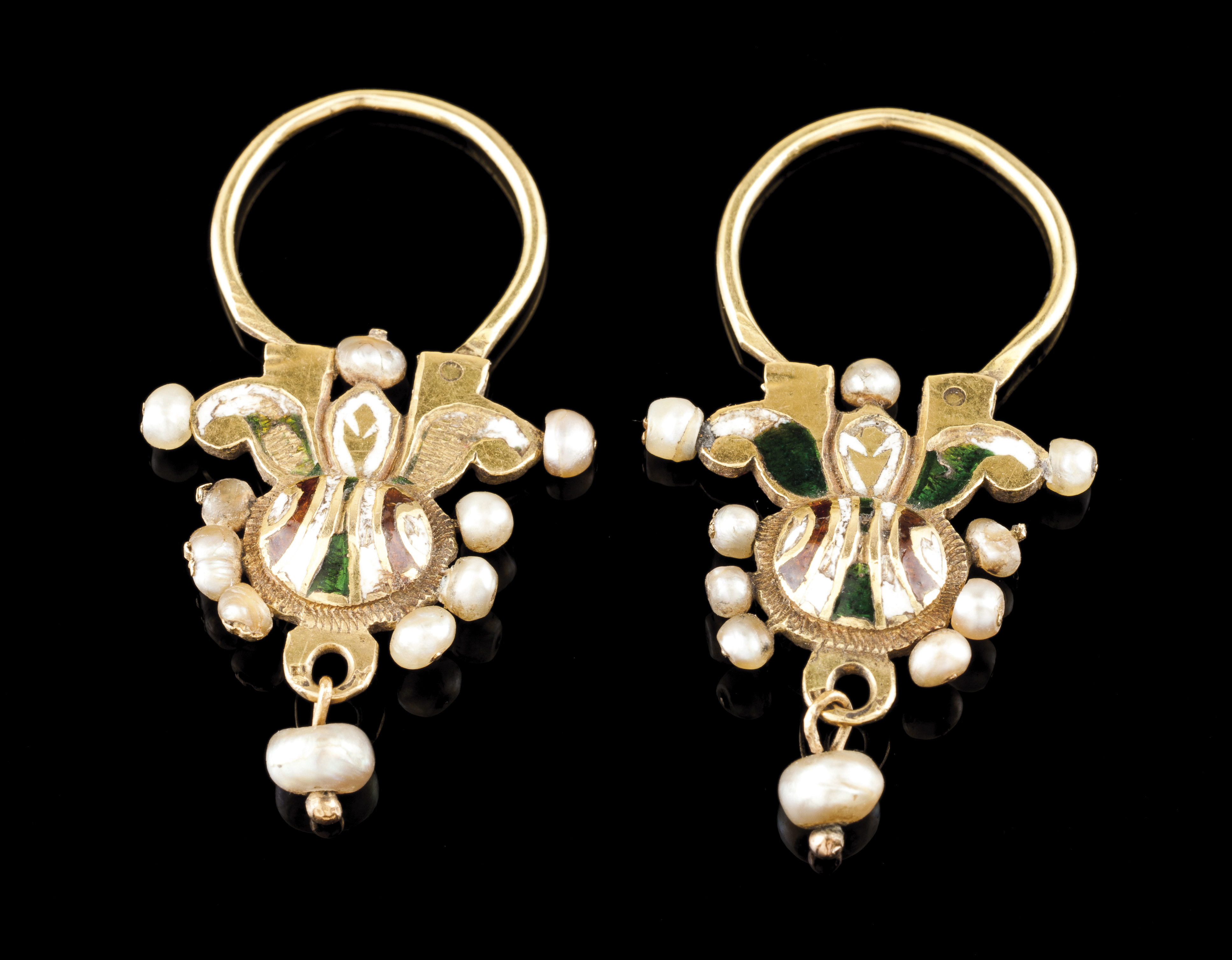 Em ouro esmaltado a branco, verde, vermelho e com aljôfares aplicados