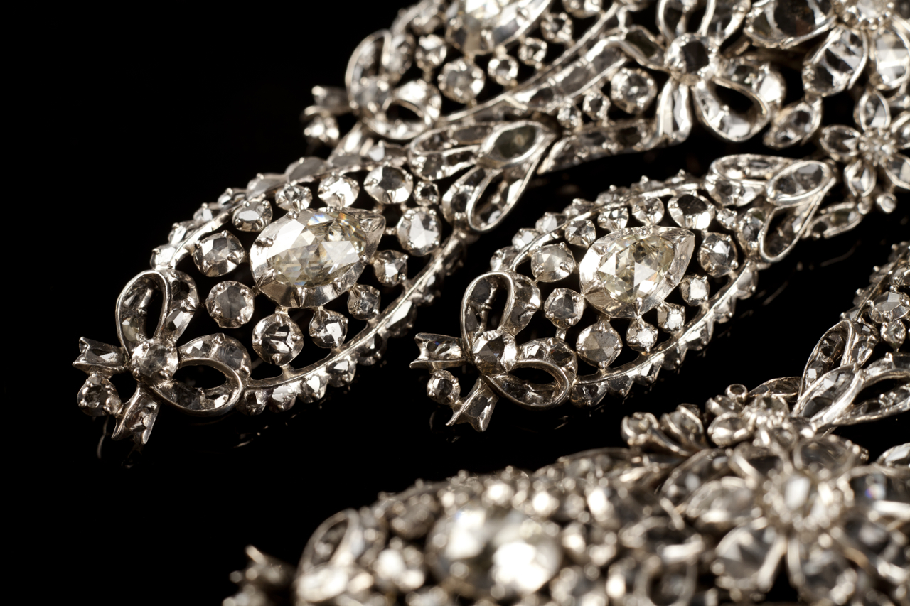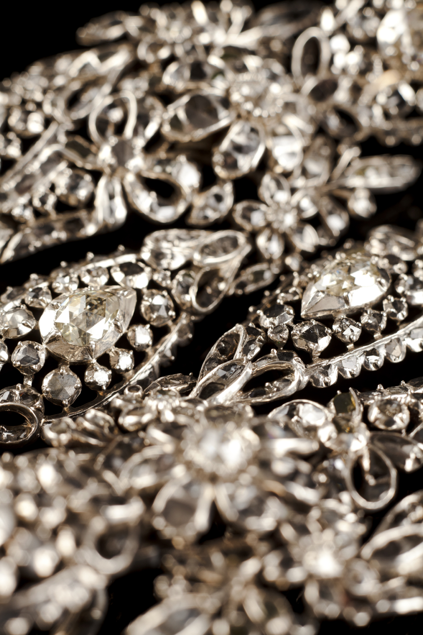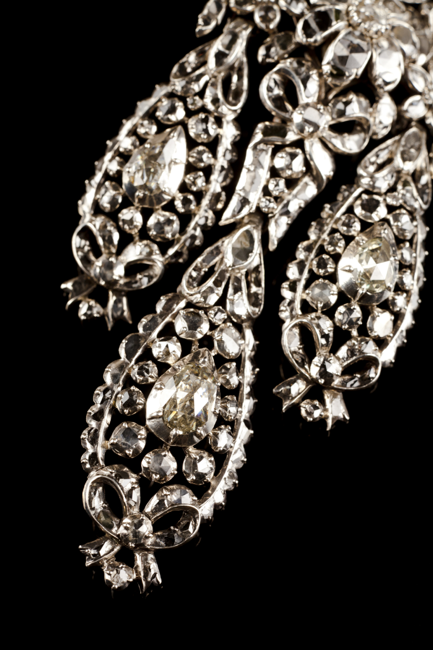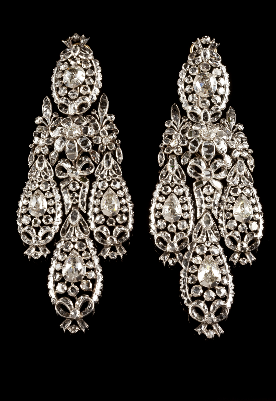 Em girândola, cravejados em prata com diamantes talhe rosa e rosa coroada