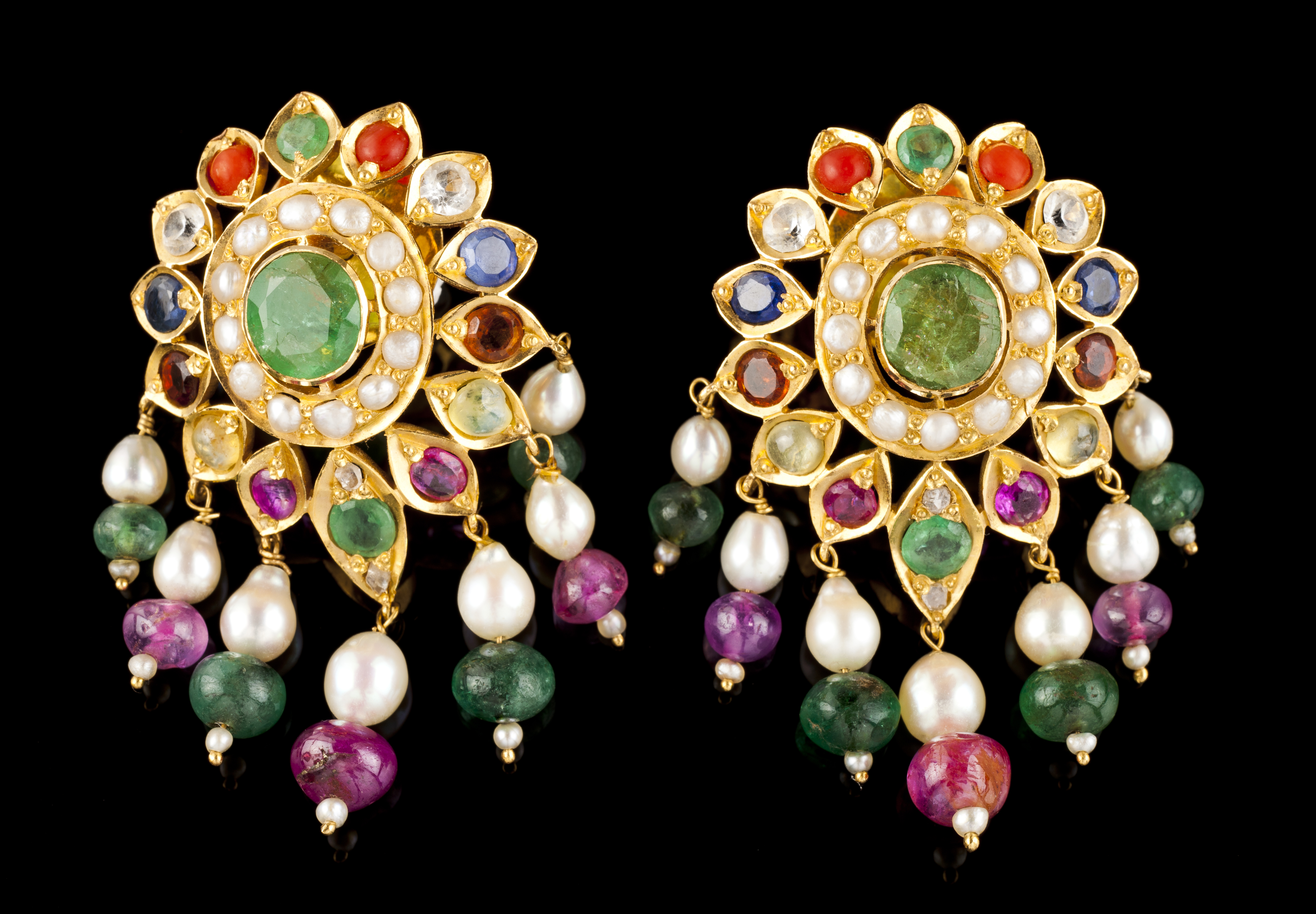 Em ouro cravejado com diversas gemas coloridas (corais, esmeraldas, safiras, granadas e rubis) e pérolas