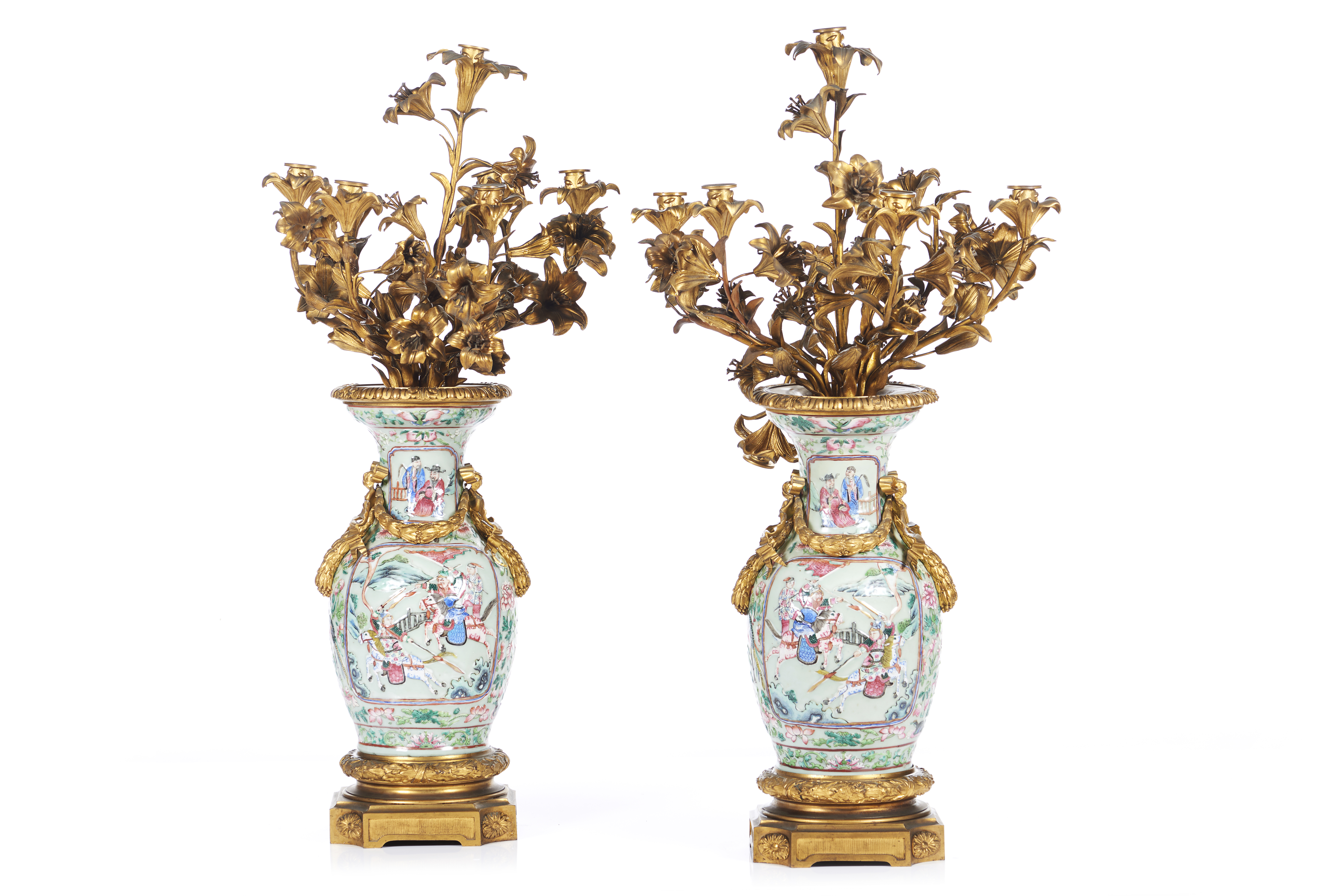 Jarrões em porcelana da China com vidrado celadon e decorados com esmaltes da Família Rosa representando paisagens com figuras, flores, frutos e pássaros
