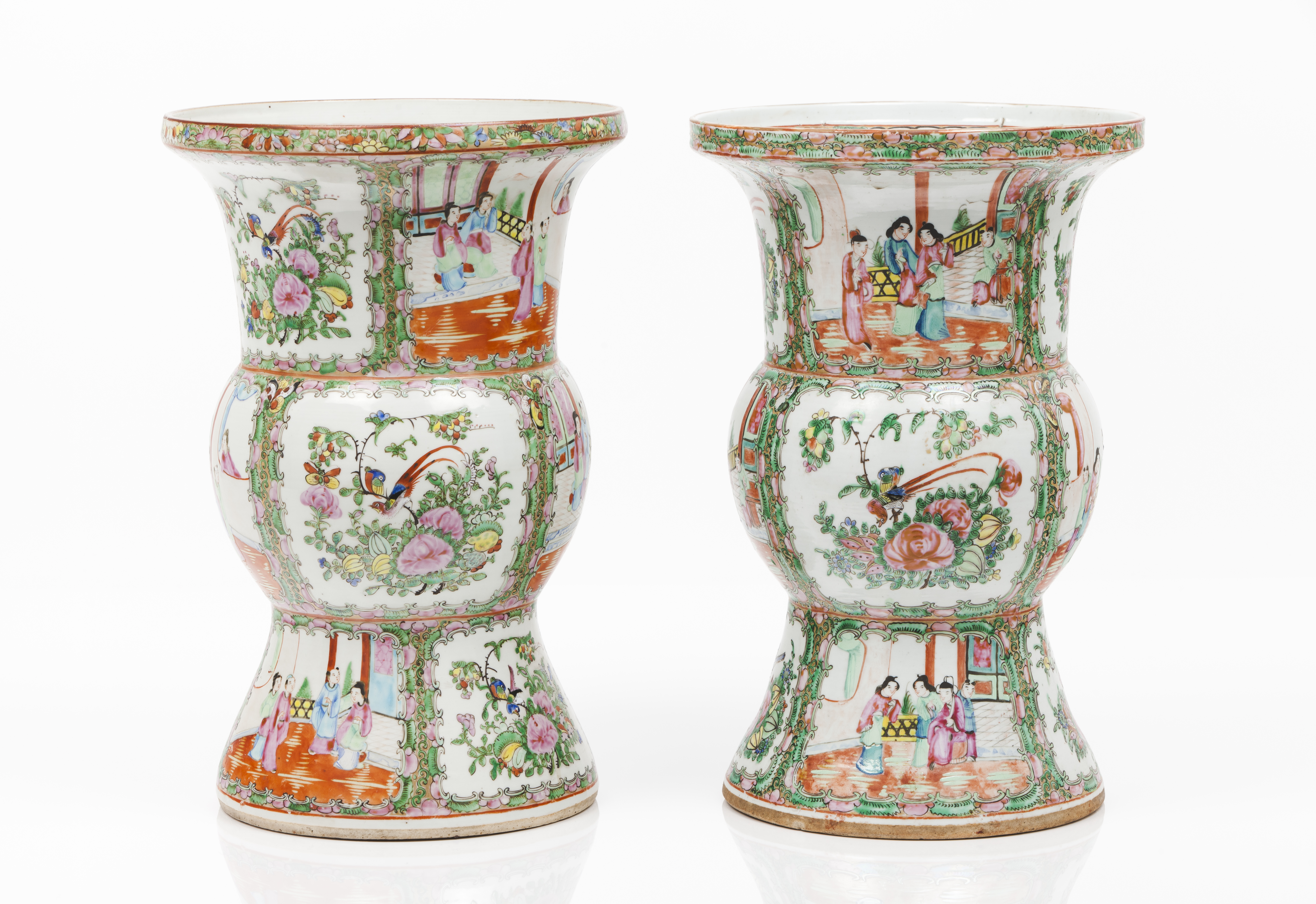 Decorados com esmaltes da Família Rosa representando vistas de interior com figuras, motivos florais, pássaros e insectos