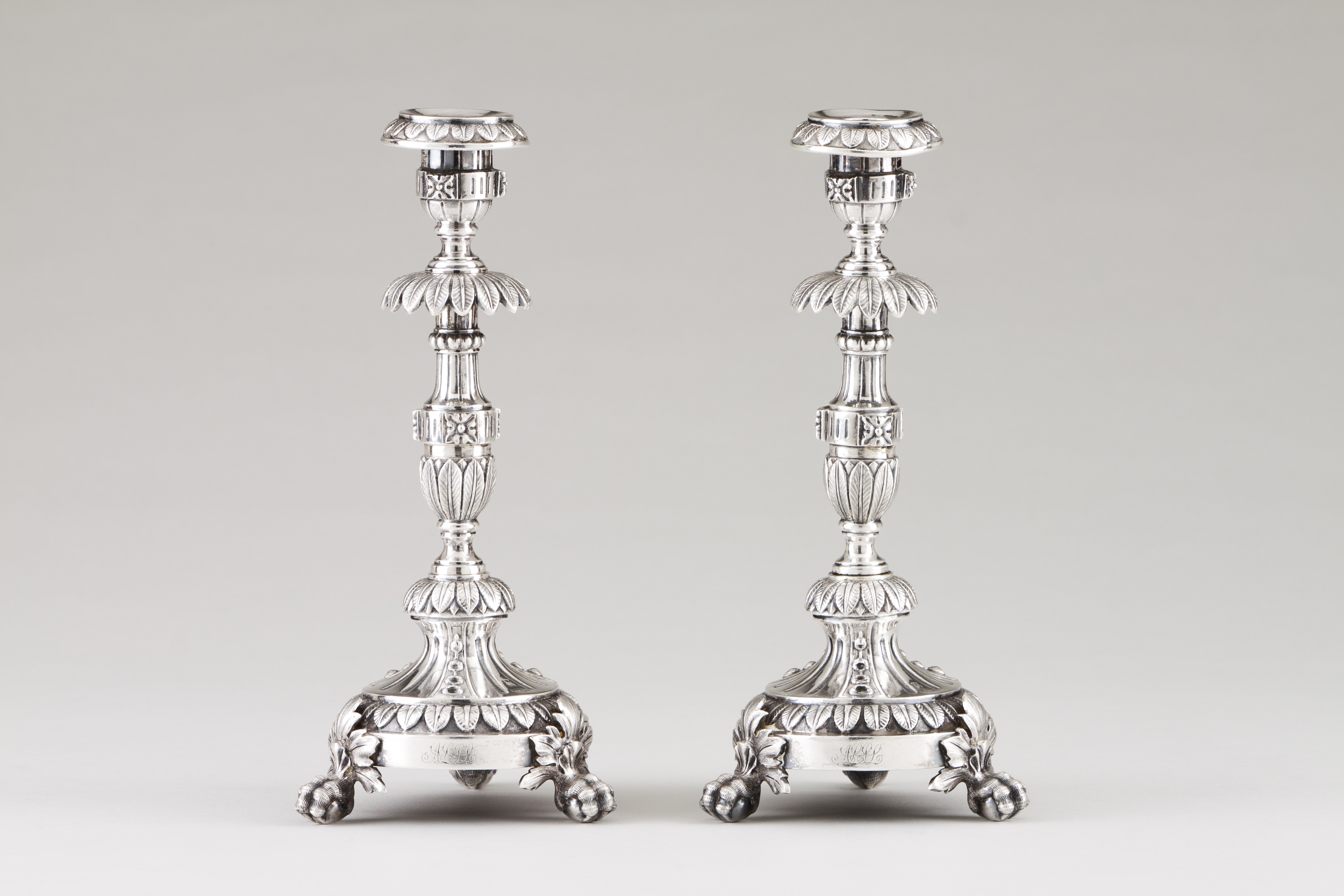 Decoração com palmetas e base circular assente em três pés de garra e bola com remate de folhagem