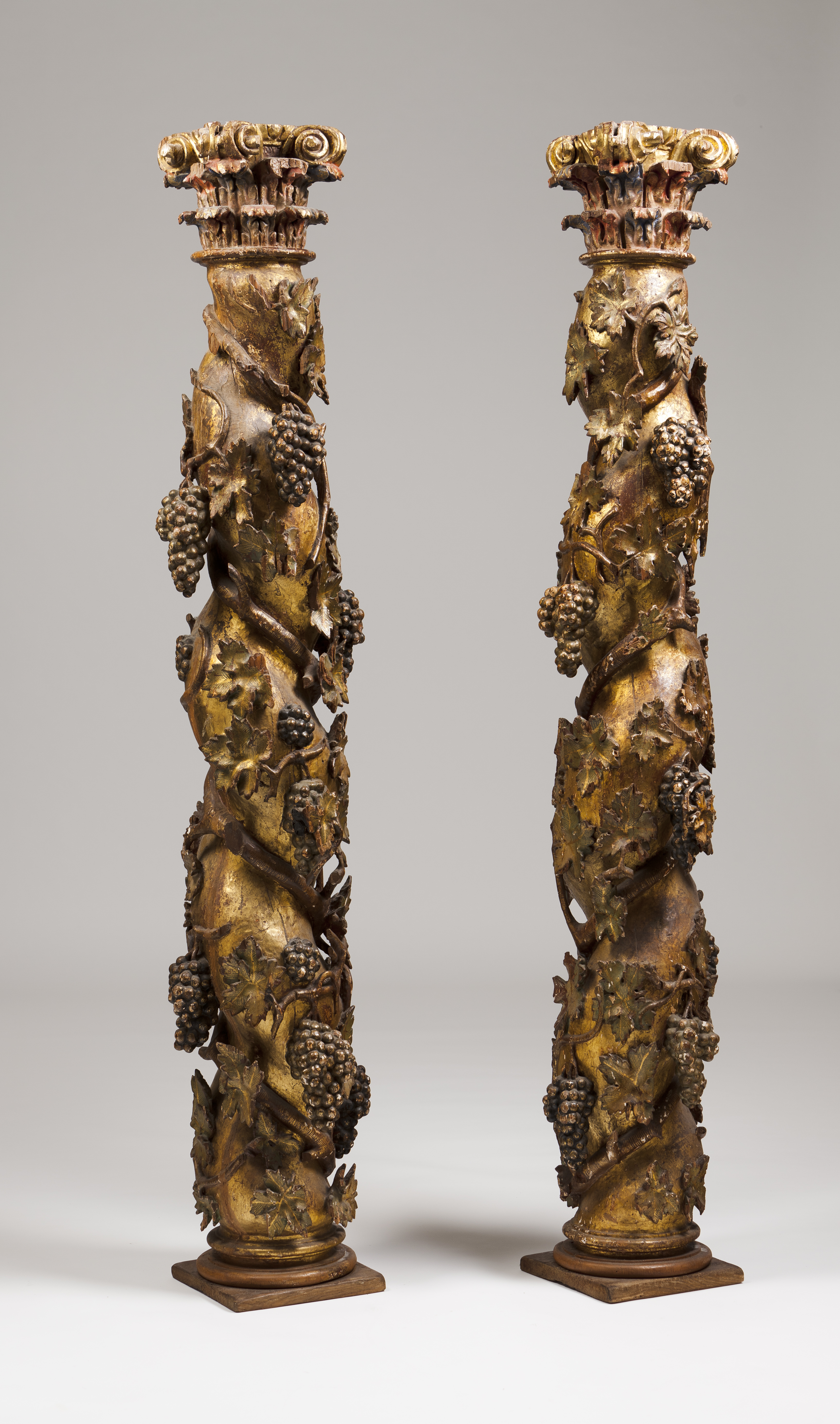 Fuste com decoração relevada, policromada e dourada representando ramos de videira com cachos de uva