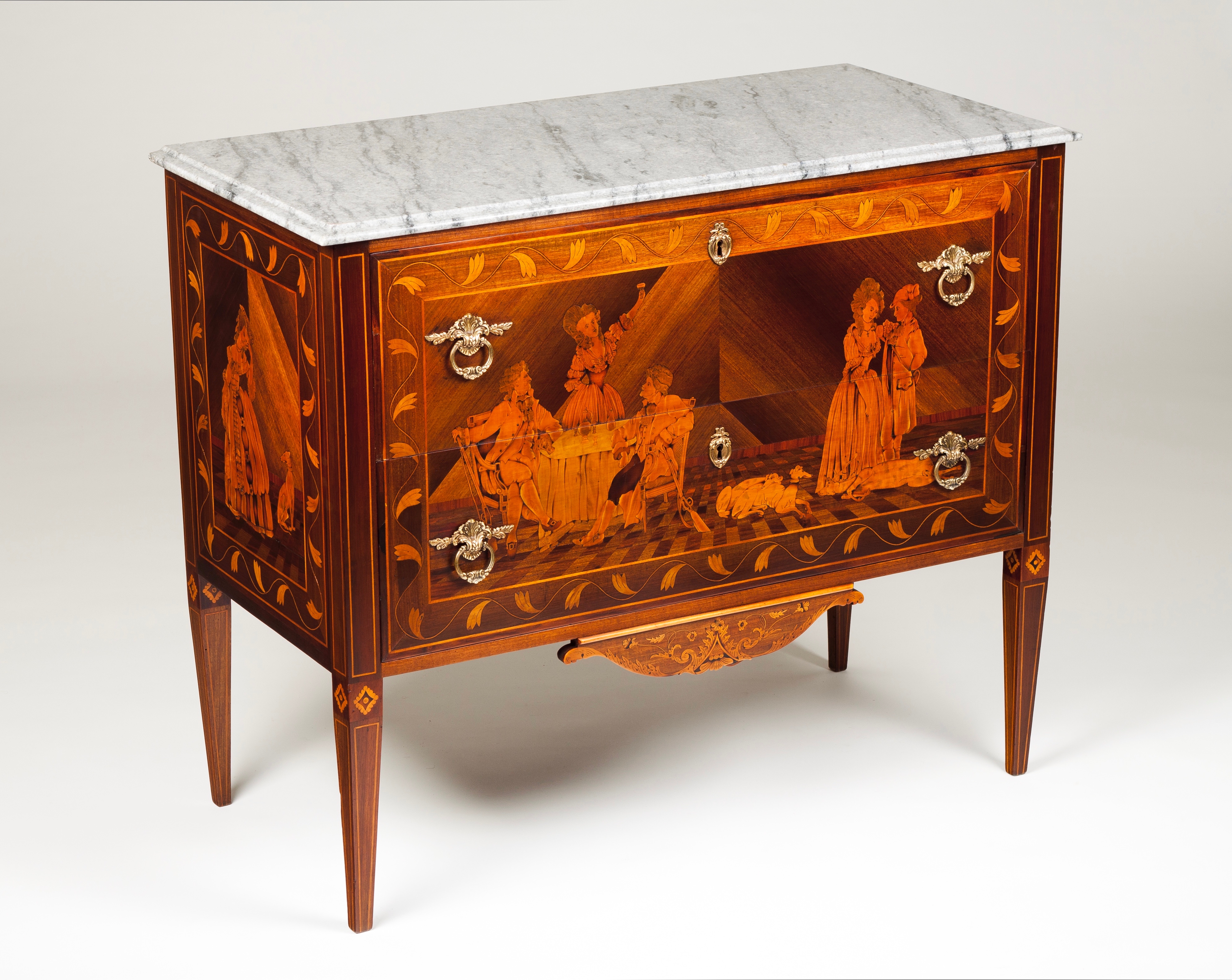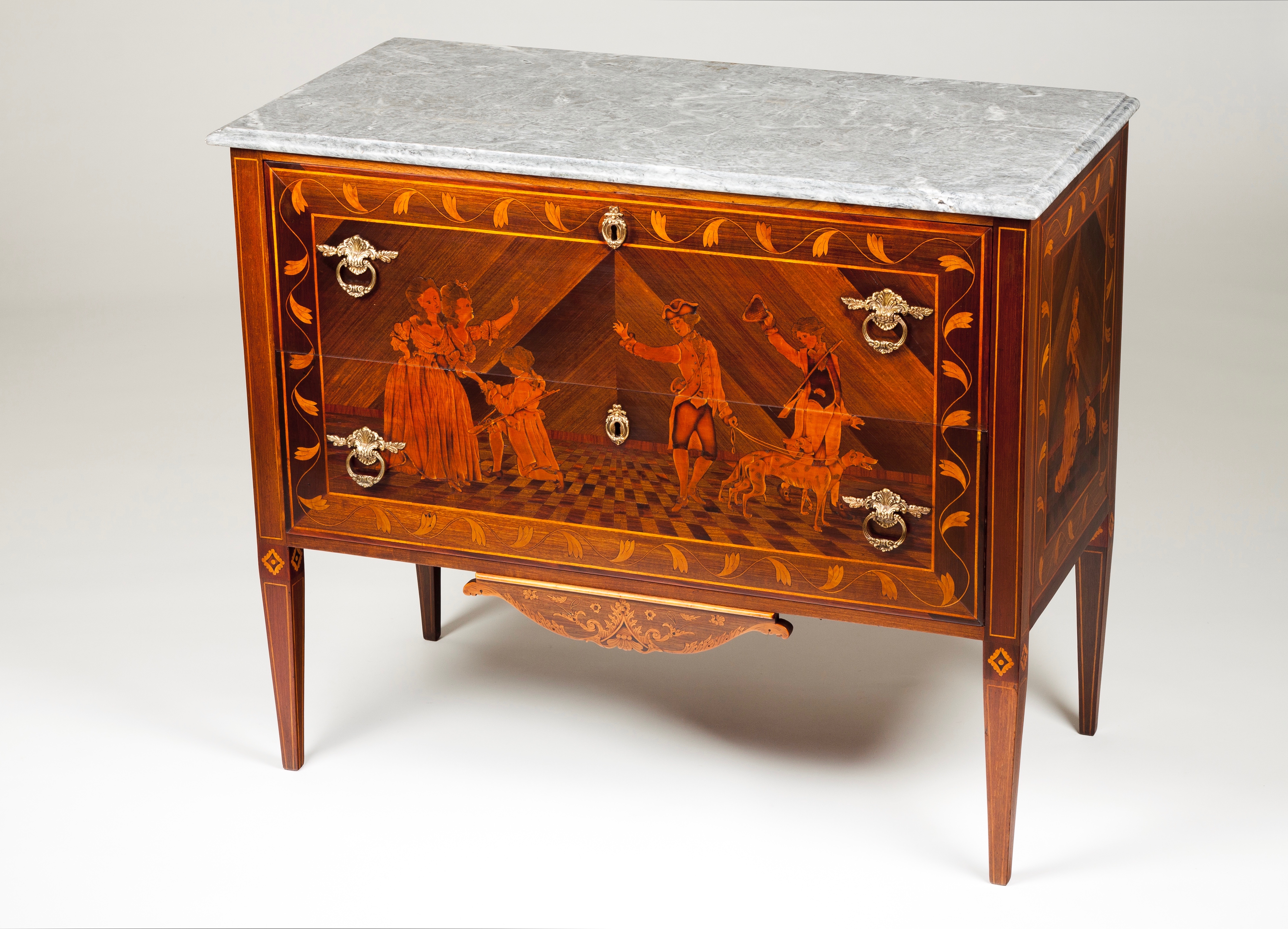 Trabalho de marchetaria em várias madeiras representando cenas galantes