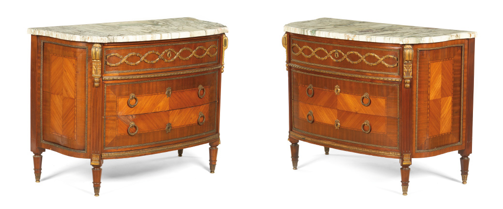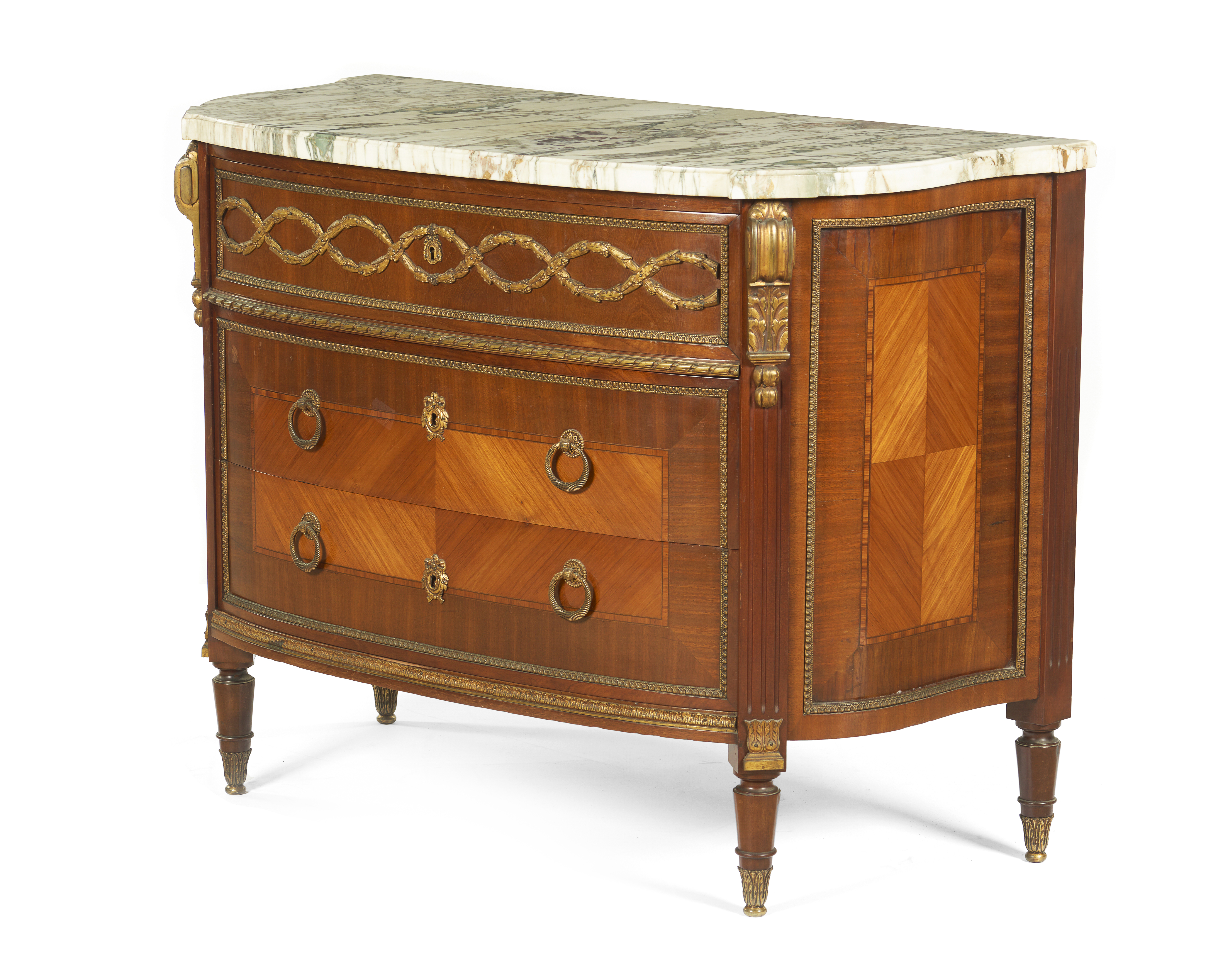 Em mogno e faixeado a mogno com trabalho de marchetaria em pau-rosa