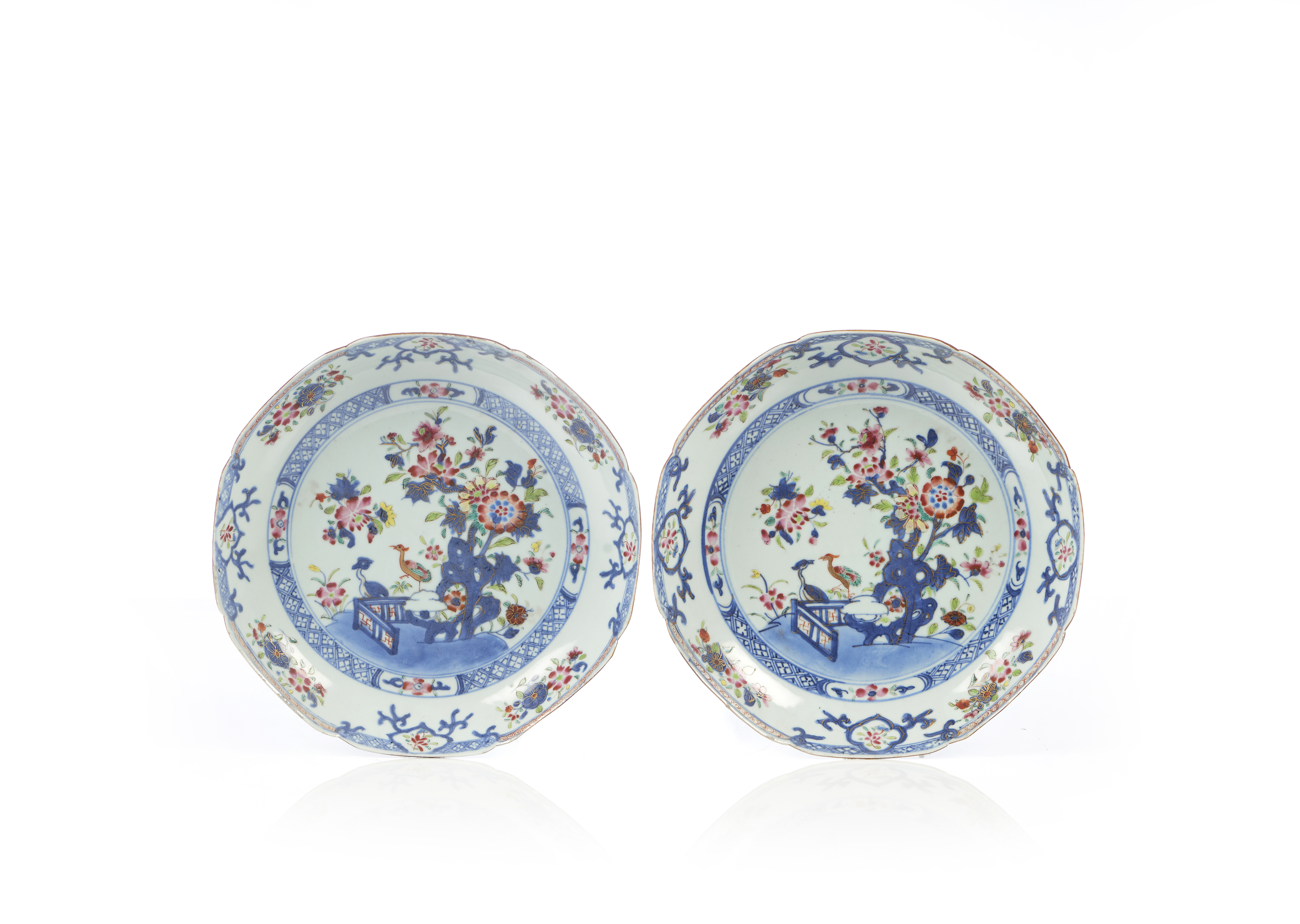 Decoração a azul, policromada e dourada representando jardim com cerca, aves e motivos florais