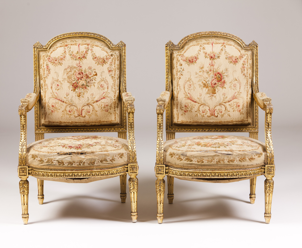 Costas, braços e assentos estofados a tapeçaria estilo Aubusson de motivos florais