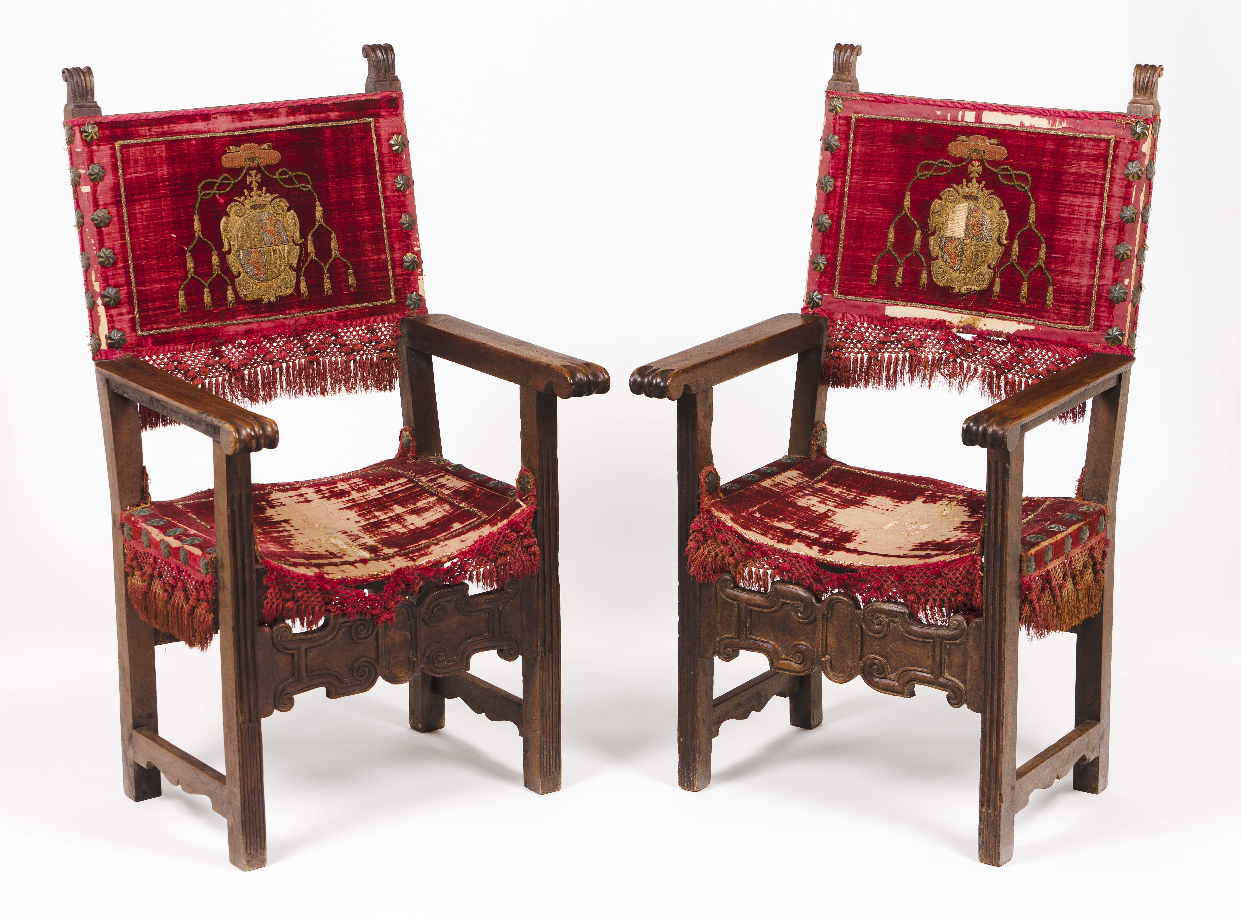 Assentos e costas forradas a veludo com pregaria e aplicações em fio de metal representando armas episcopais, possivelmente de D. Frei Luís da Silva Teles, bispo de Lamego de 1677 a 1685, com brasão de armas dos Teles de Menezes