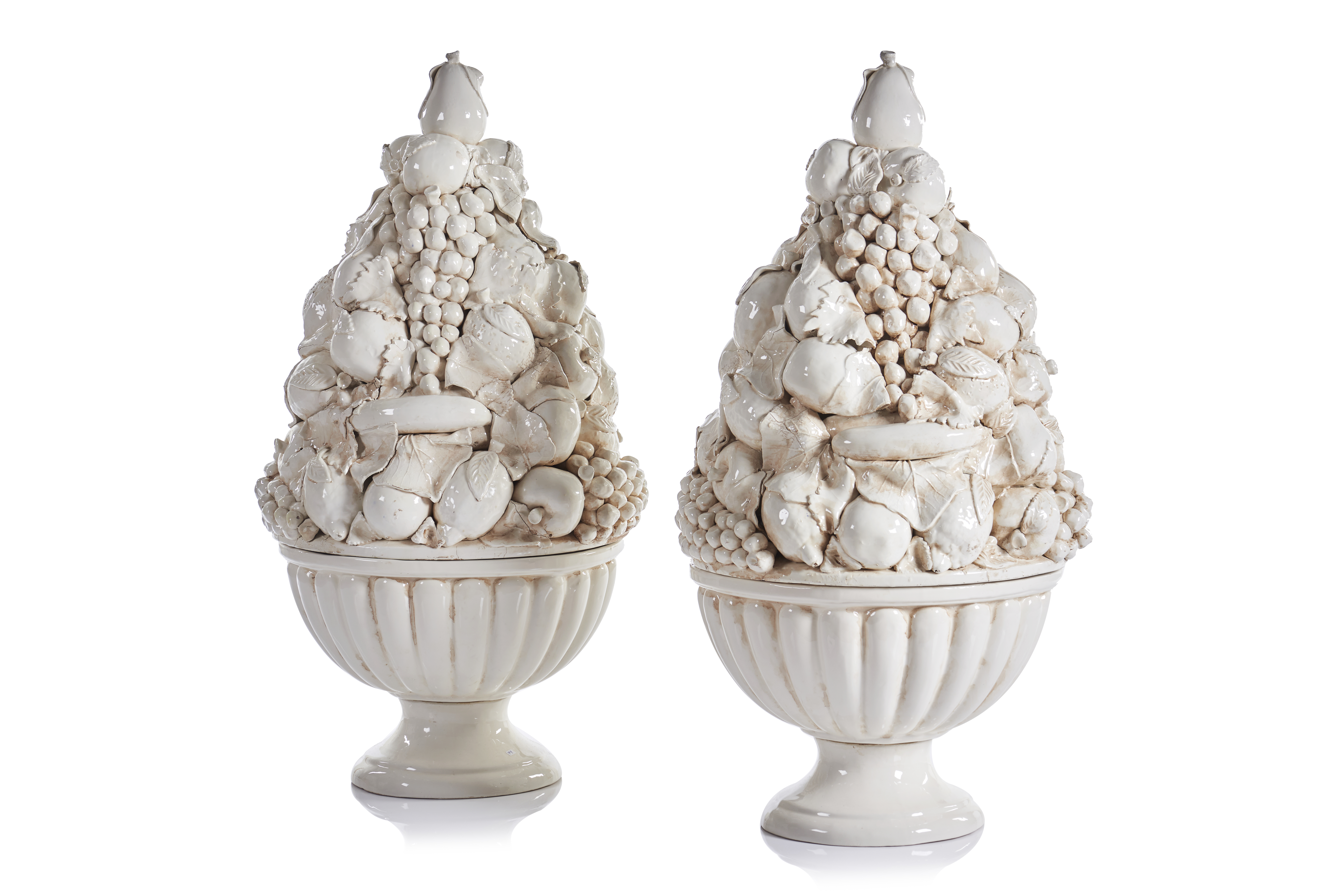 Cada um moldado em forma de taça com pé encimada por uma tampa alta, moldada em trompe l'oeil, representando uma pilha de frutas
