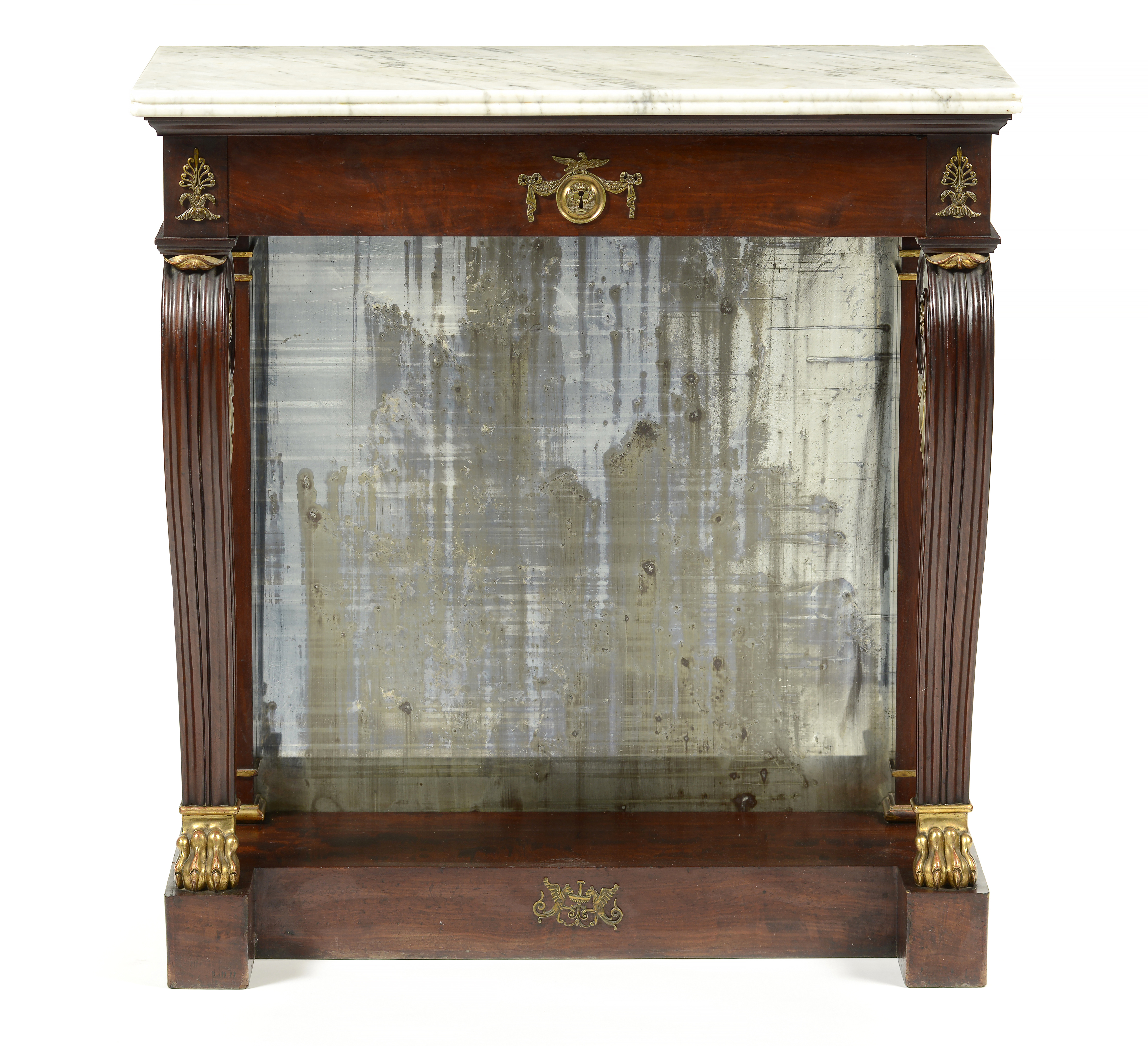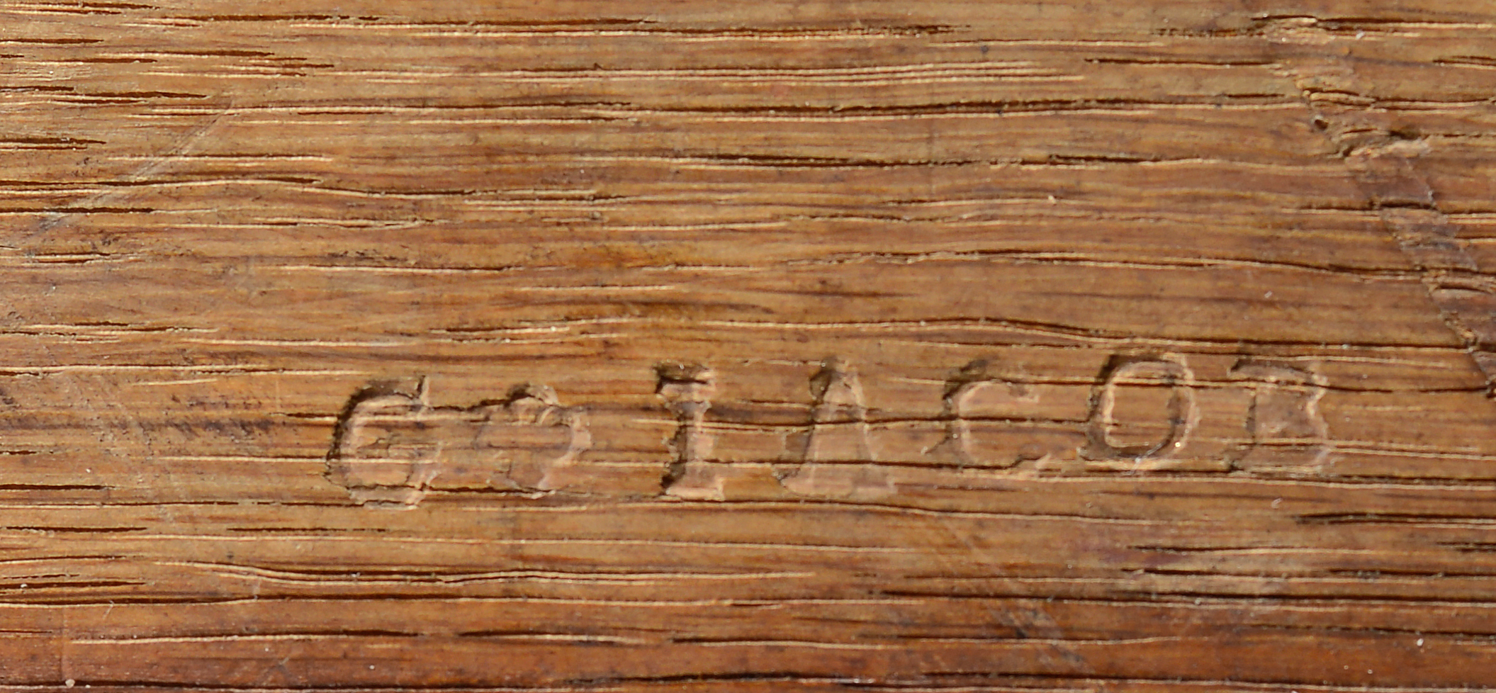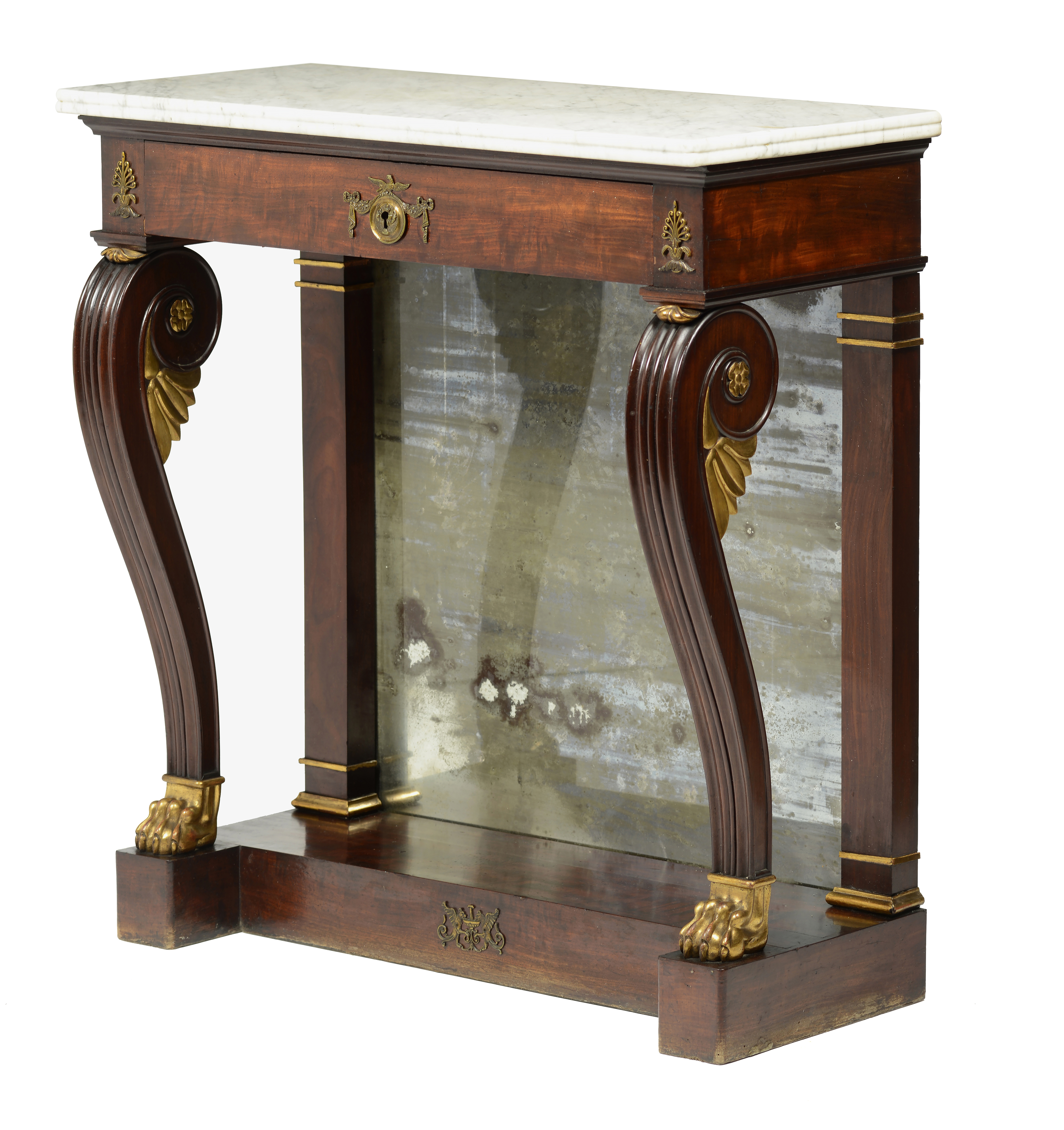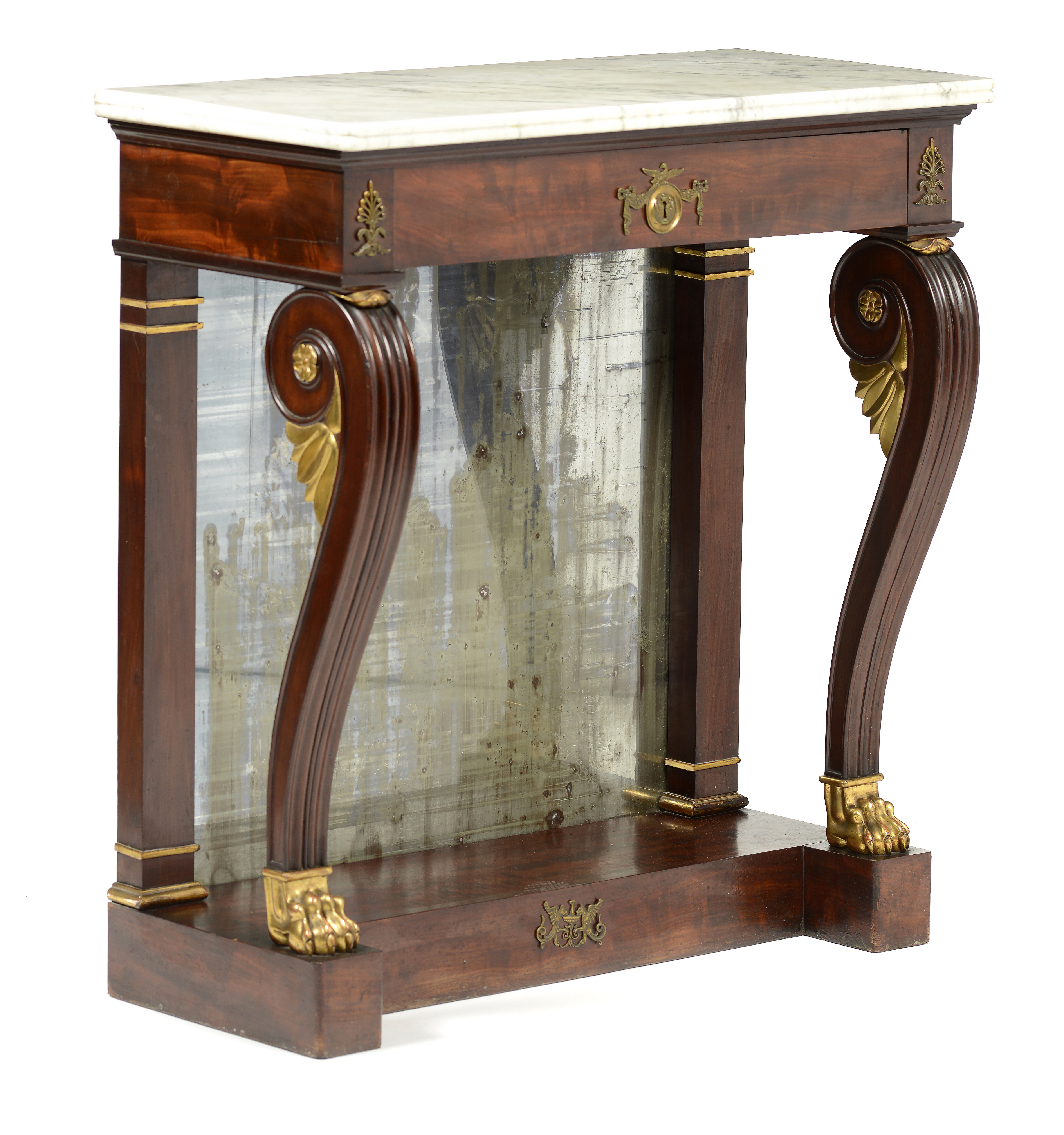 Pernas dianteiras em forma de voluta, com decoração entalhada e terminações em forma de garra