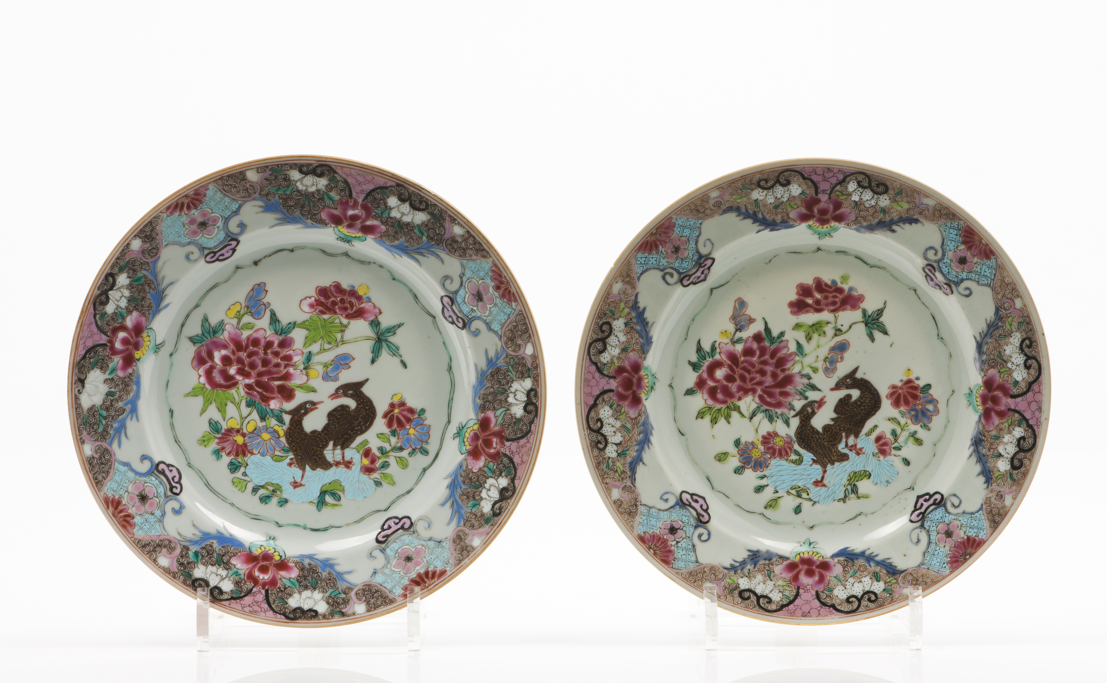 Decoração policromada com esmaltes da Família Rosa representando ao centro composição com flores e patos