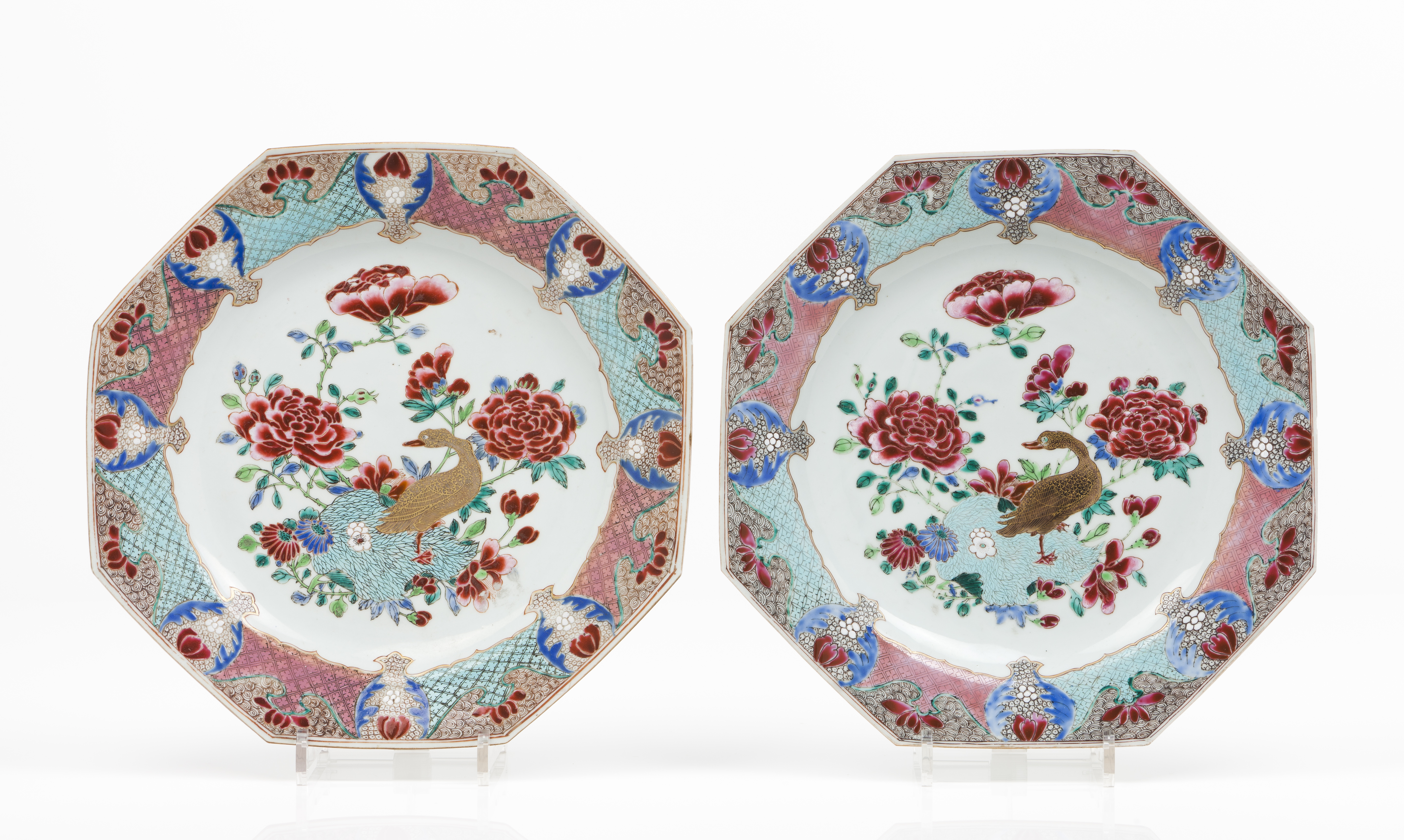 Decoração policromada com esmaltes da Família Rosa representando ao centro ganso sobre folha de nenúfar, rodeado por peónias e crisântemos