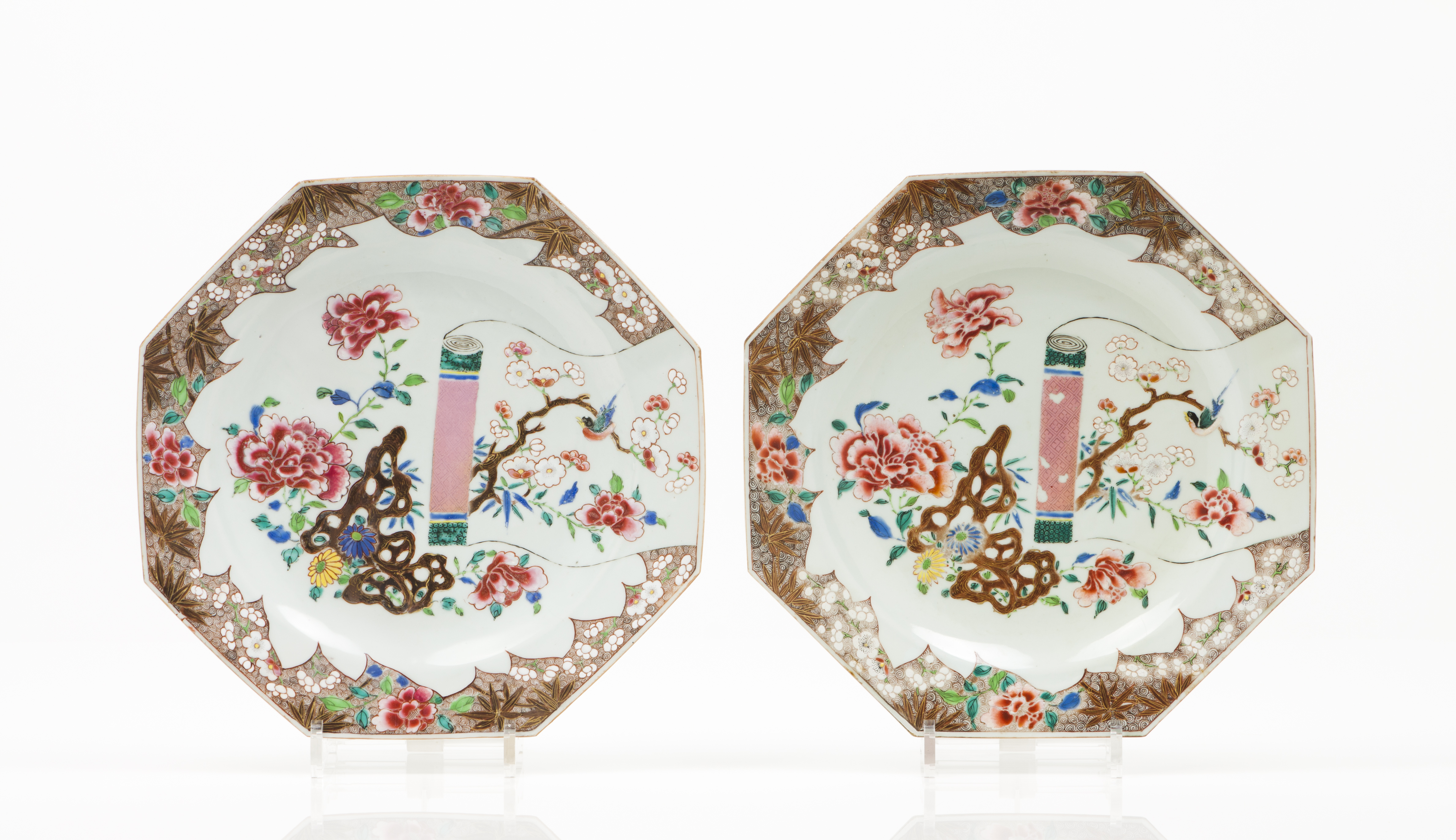 Decoração policromada com esmaltes da Família Rosa representando motivos florais e scrolls e pássaros