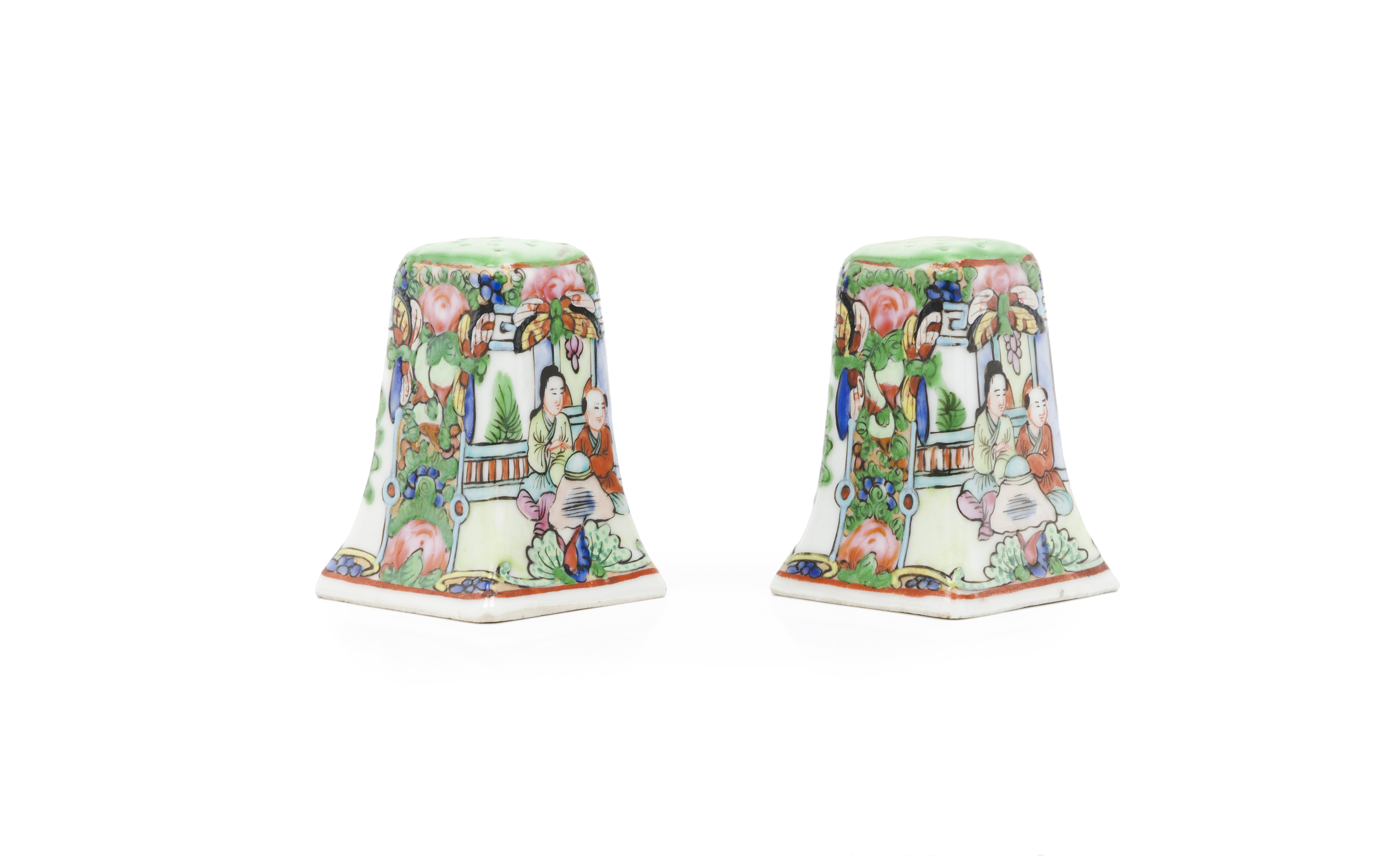Porcelana de decoração "Rose Médallion" com 2 cartelas emolduradas por flores e folhagem em campo dourado, uma com cenas de corte e a outra com peónias