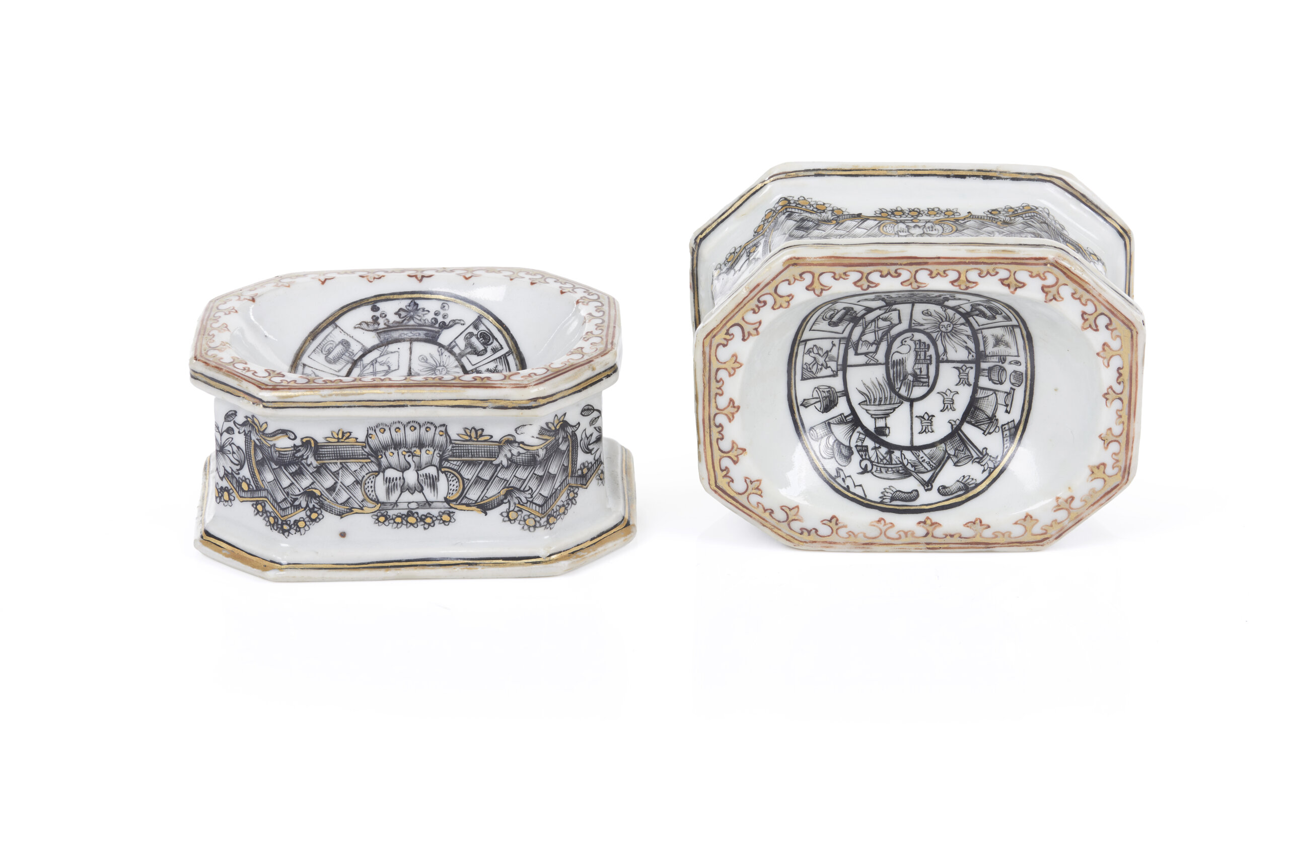 De forma octogonal, assente sobre base, decorado em grisaille e dourado