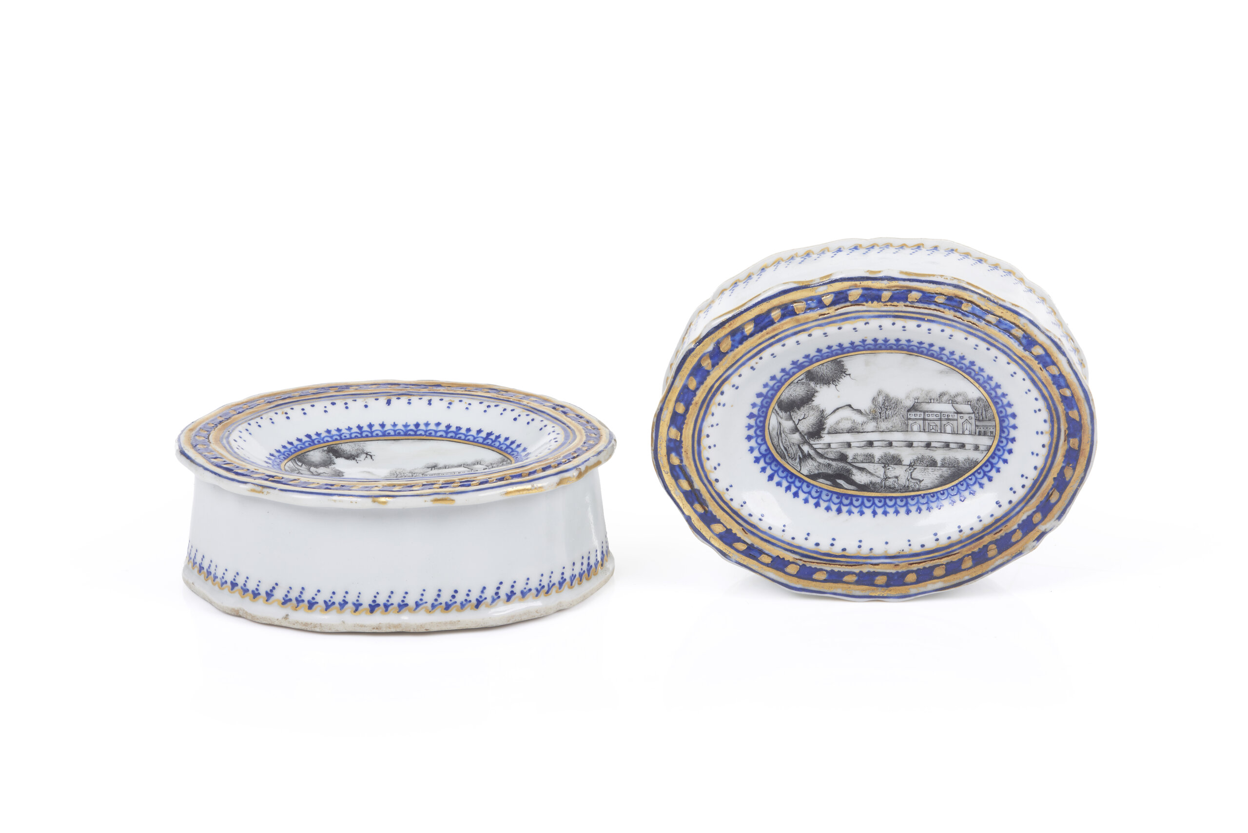 Decoração a grisaille e azul representando ao centro paisagem com animais e casario