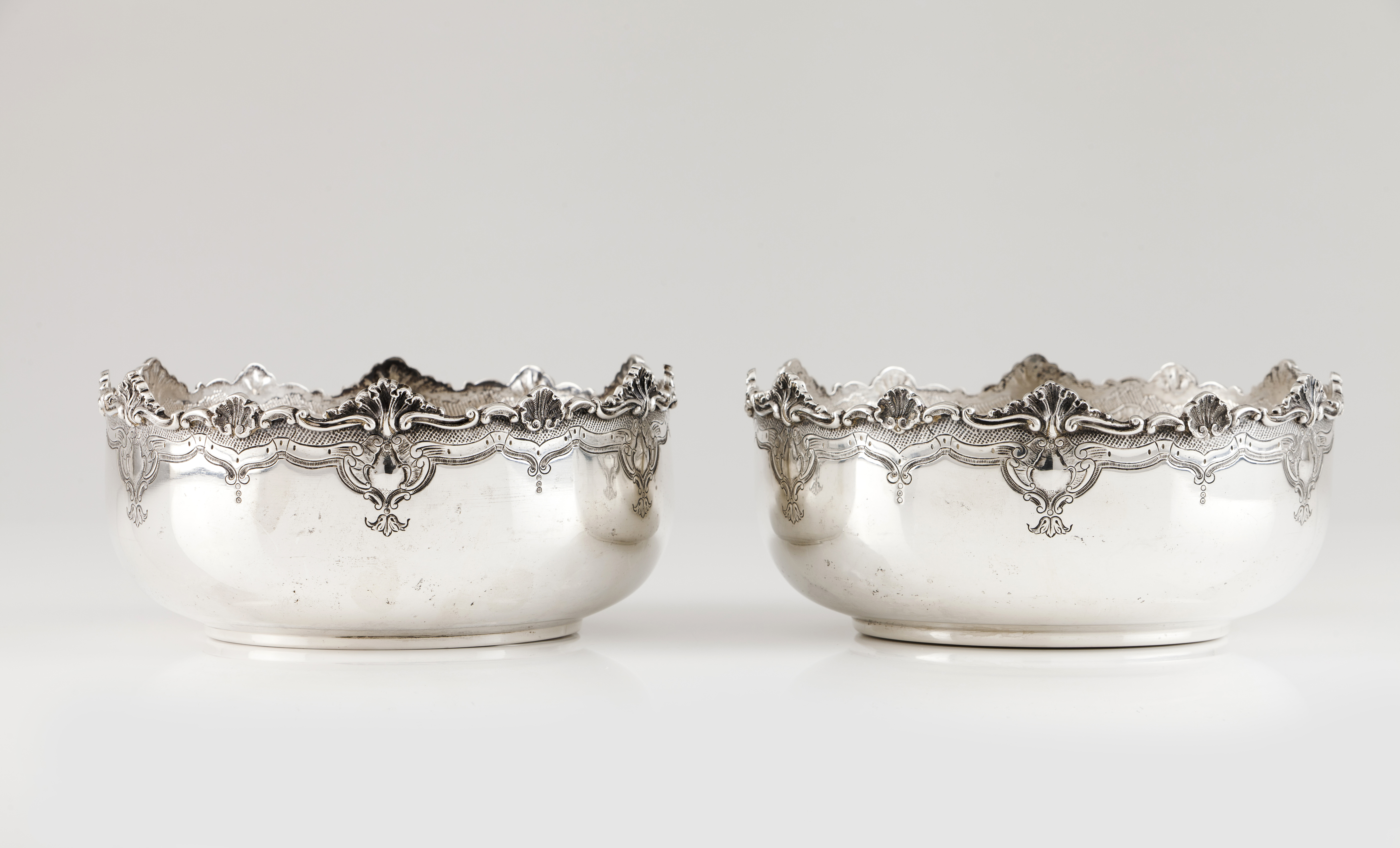 Corpo liso, com bordo recortado com decoração relevada e gravada de concheados, aletas e medalhões