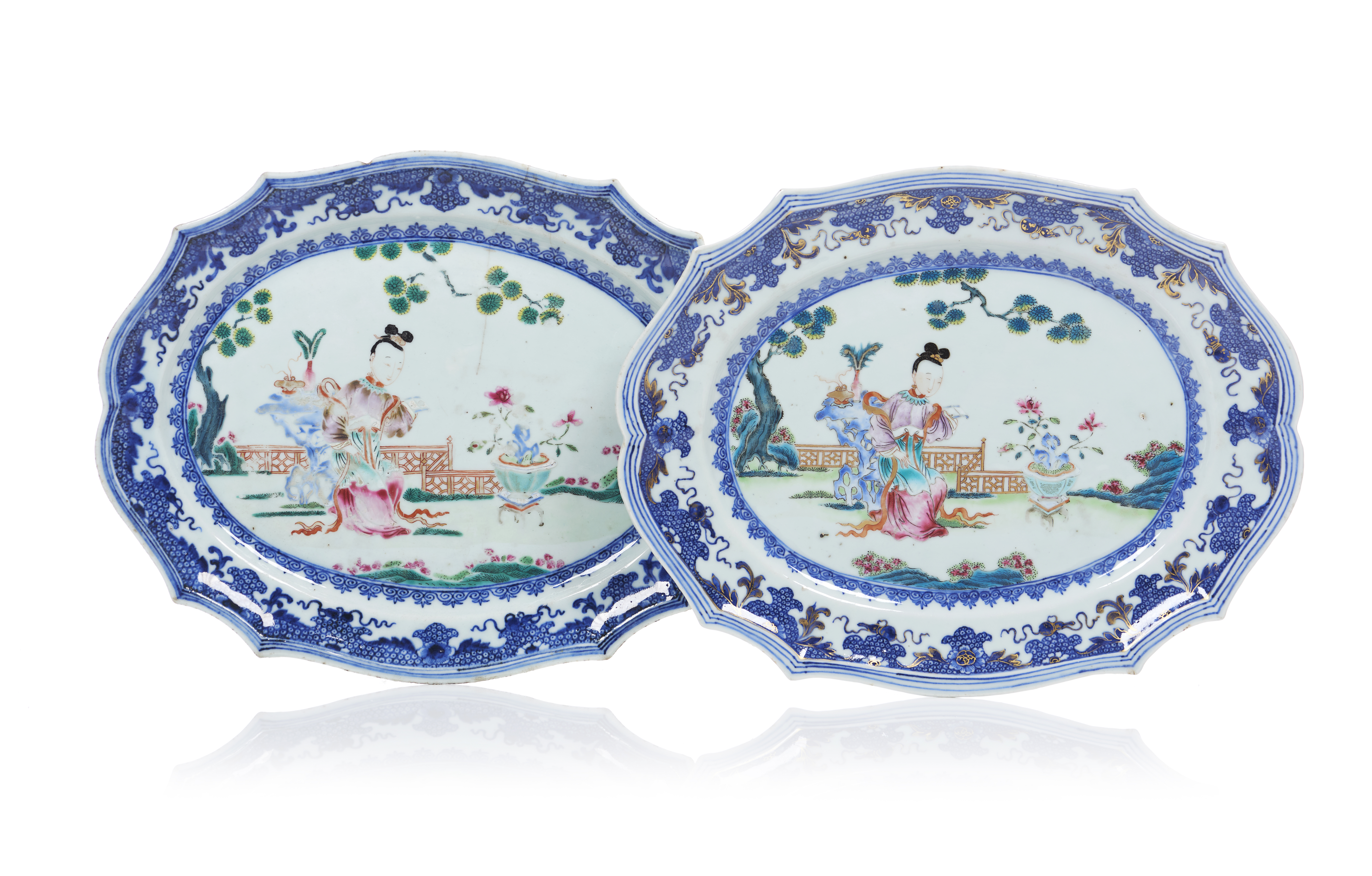 Decorado com esmaltes da Família Rosa representando ao centro uma vista de jardim com uma figura feminina – serviço frequentemente designado por “serviço da princesinha”