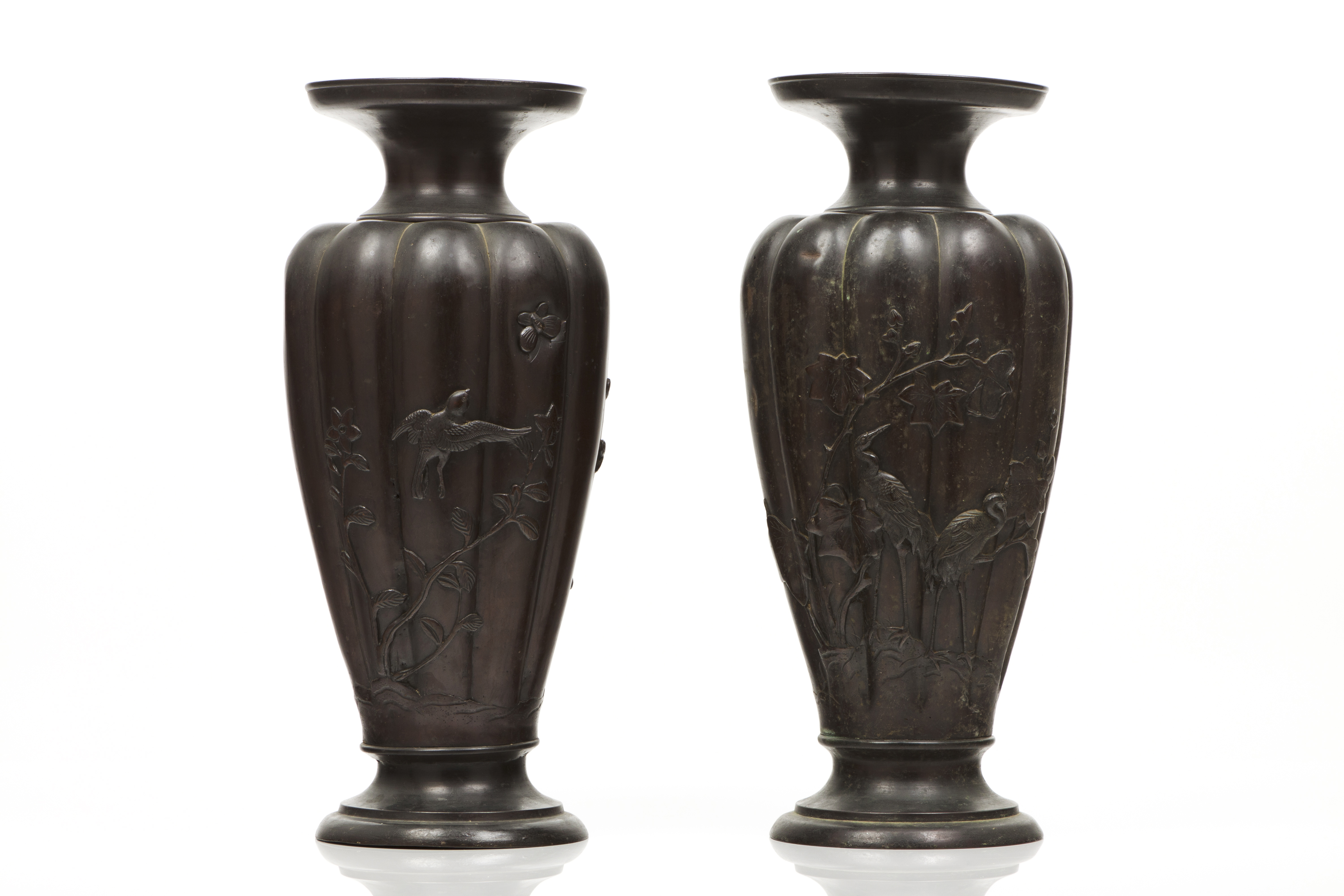 Em forma de balaústre, gomados e com decoração relevada representando garças e outros pássaros