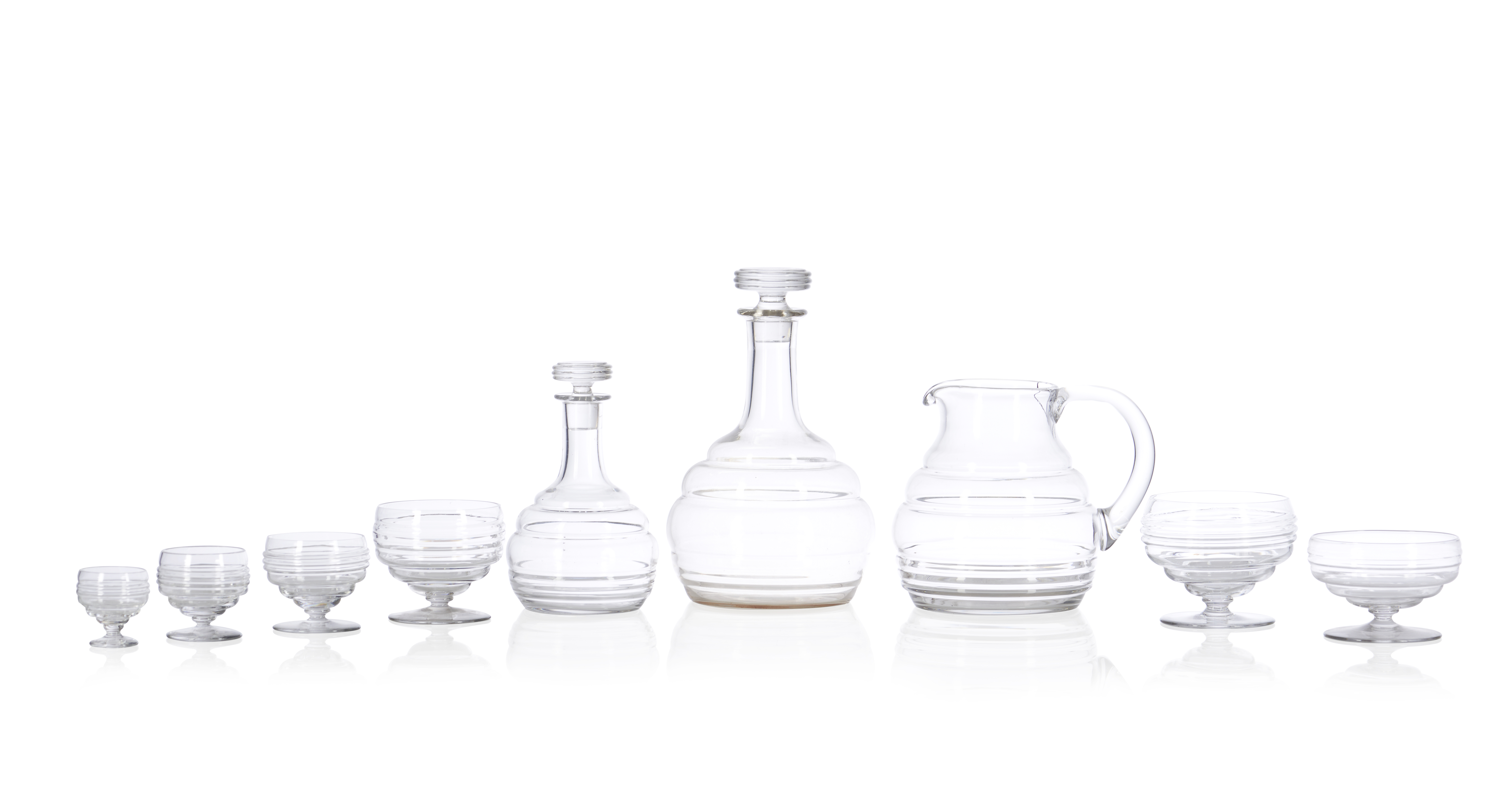 Composto por 11 copos para água, 11 copos para vinho tinto, 11 copos para vinho branco, 7 copos para Sherry, 11 copos para licor, 1 jarro para água e duas garrafas com tampas de diferentes tamanhos