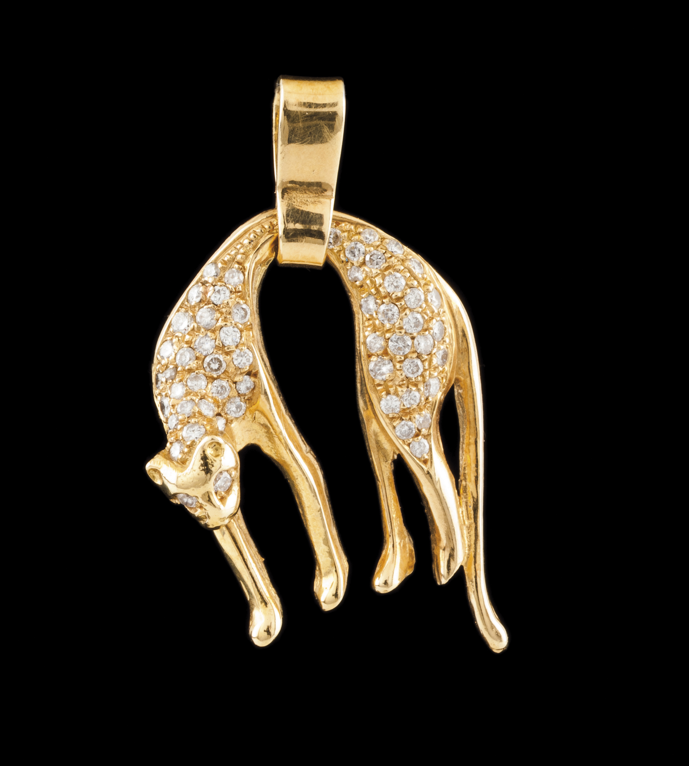 Em ouro (750/000) cravejado com pequenos diamantes talhe brilhante, representando um gato pendurado