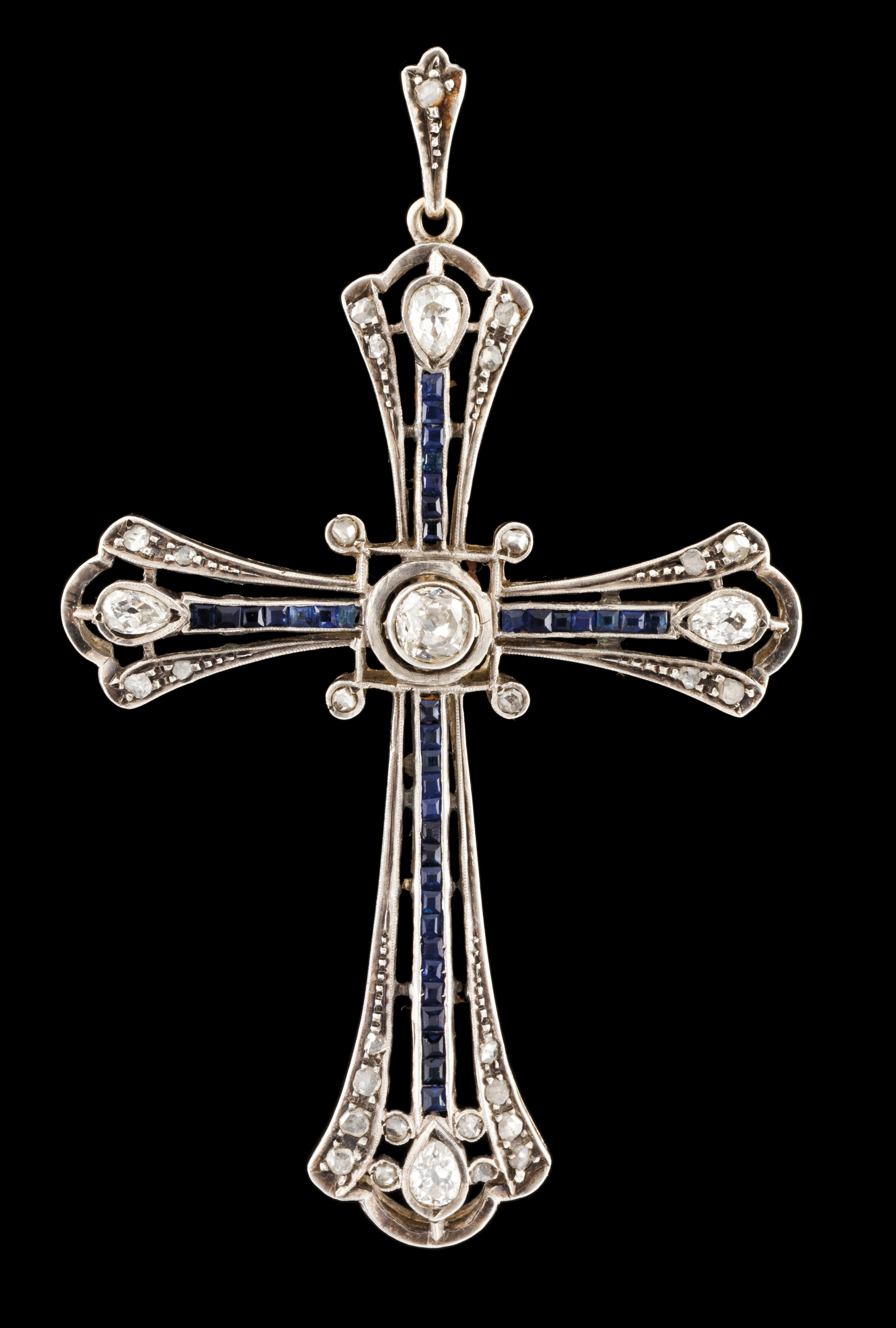 Em ouro e platina cravejado com safiras calibradas, diamantes talhe rosa, um diamante talhe antigo de brilhante (ca. 0,30ct) e quatro diamantes talhe pêra antiga (ca. 0,90ct)