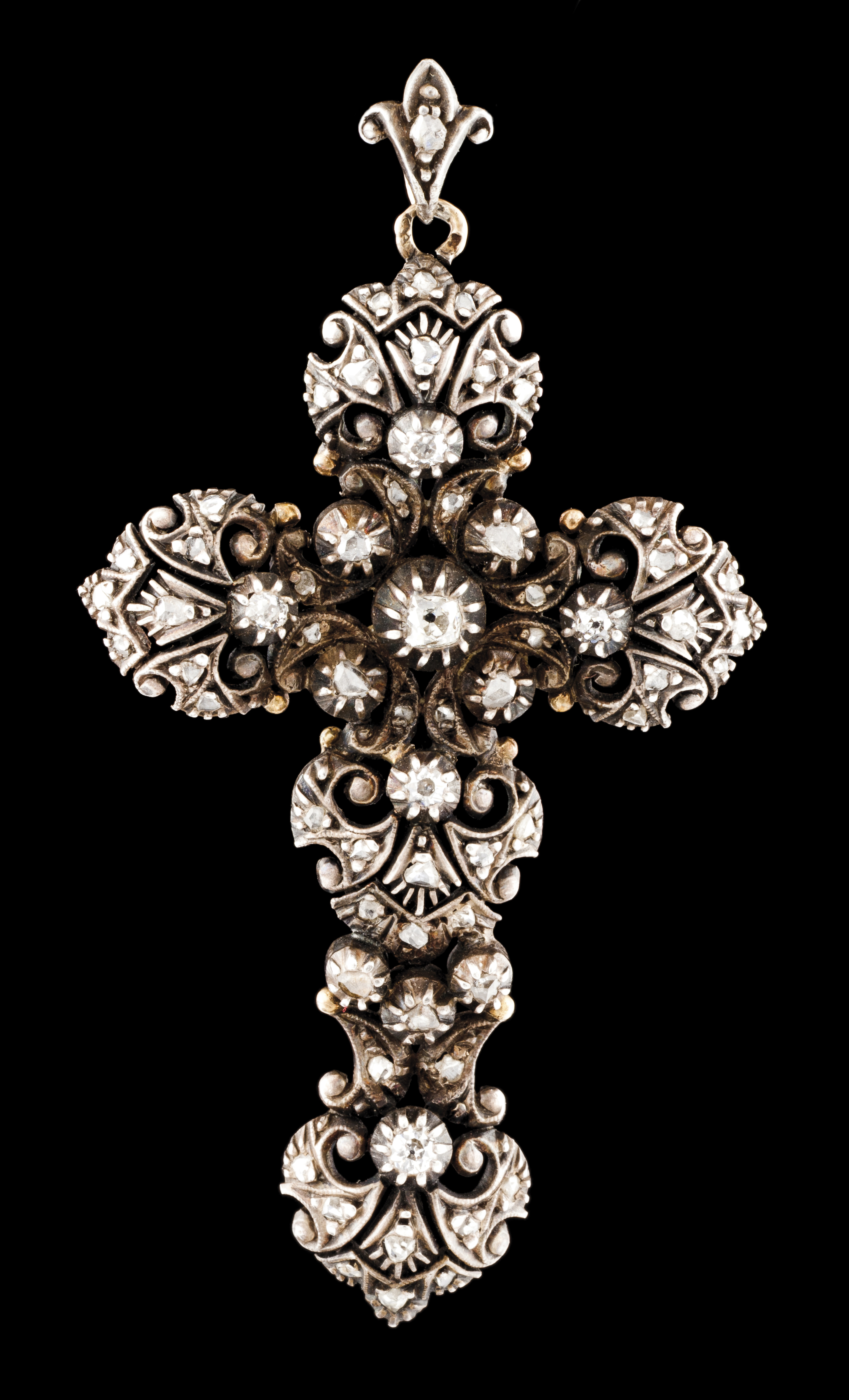 Em prata e ouro cravejado com diamantes talhe rosa e seis diamantes talhe antigo de brilhante (ca. 0,15ct)