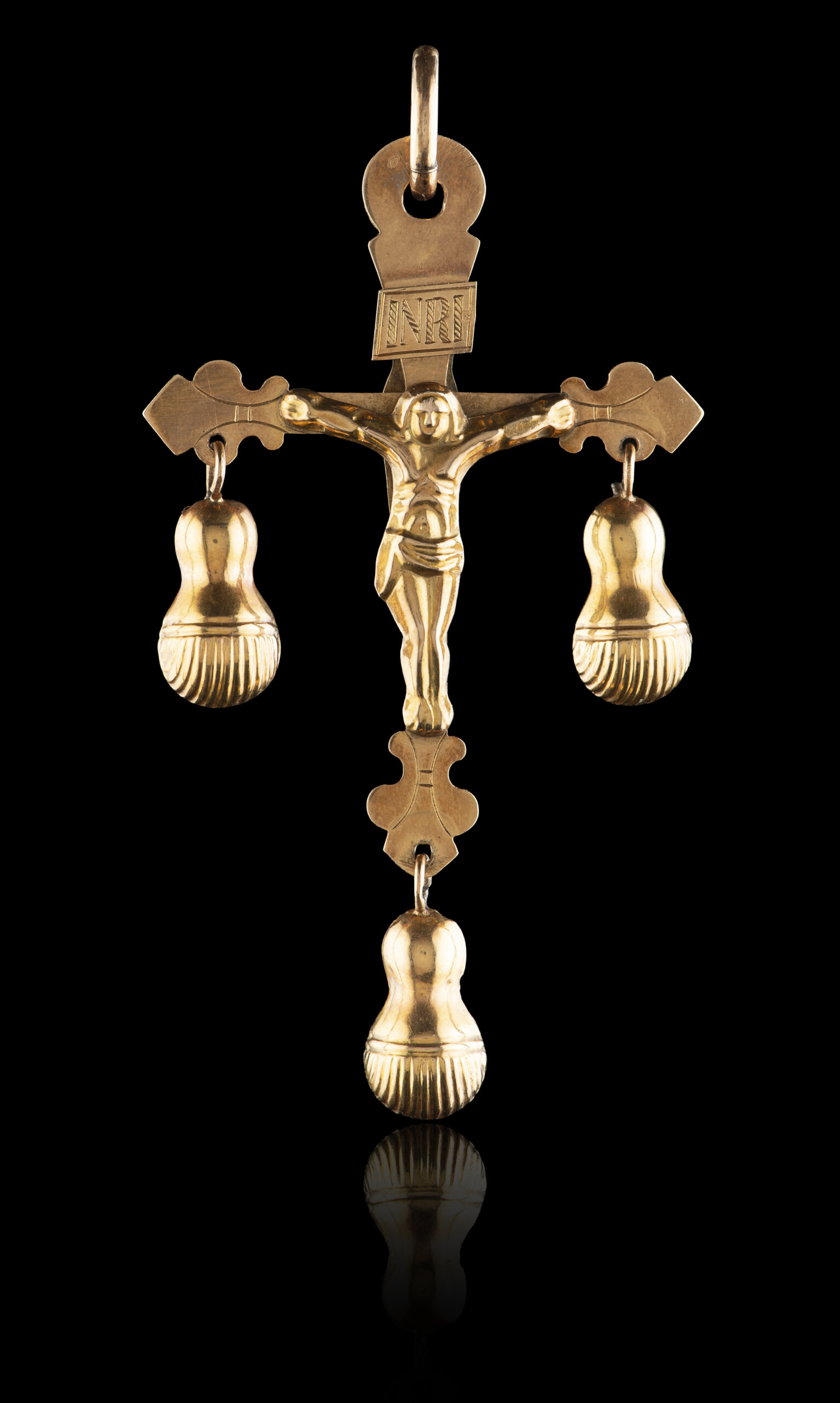 acompanhado por Relatórios de Ensaio ao teor do metal - realizado por Espetrometria de Fluorescência de Raios-X Dispersiva de Energias (EFRXDE) - o qual é de 703 milésimos na zona da cruz e de 528 milésimos nos pendentes, realizados e emitidos pela IN-CM, nº 0091/LML/2026 e 0092/LML/2026.