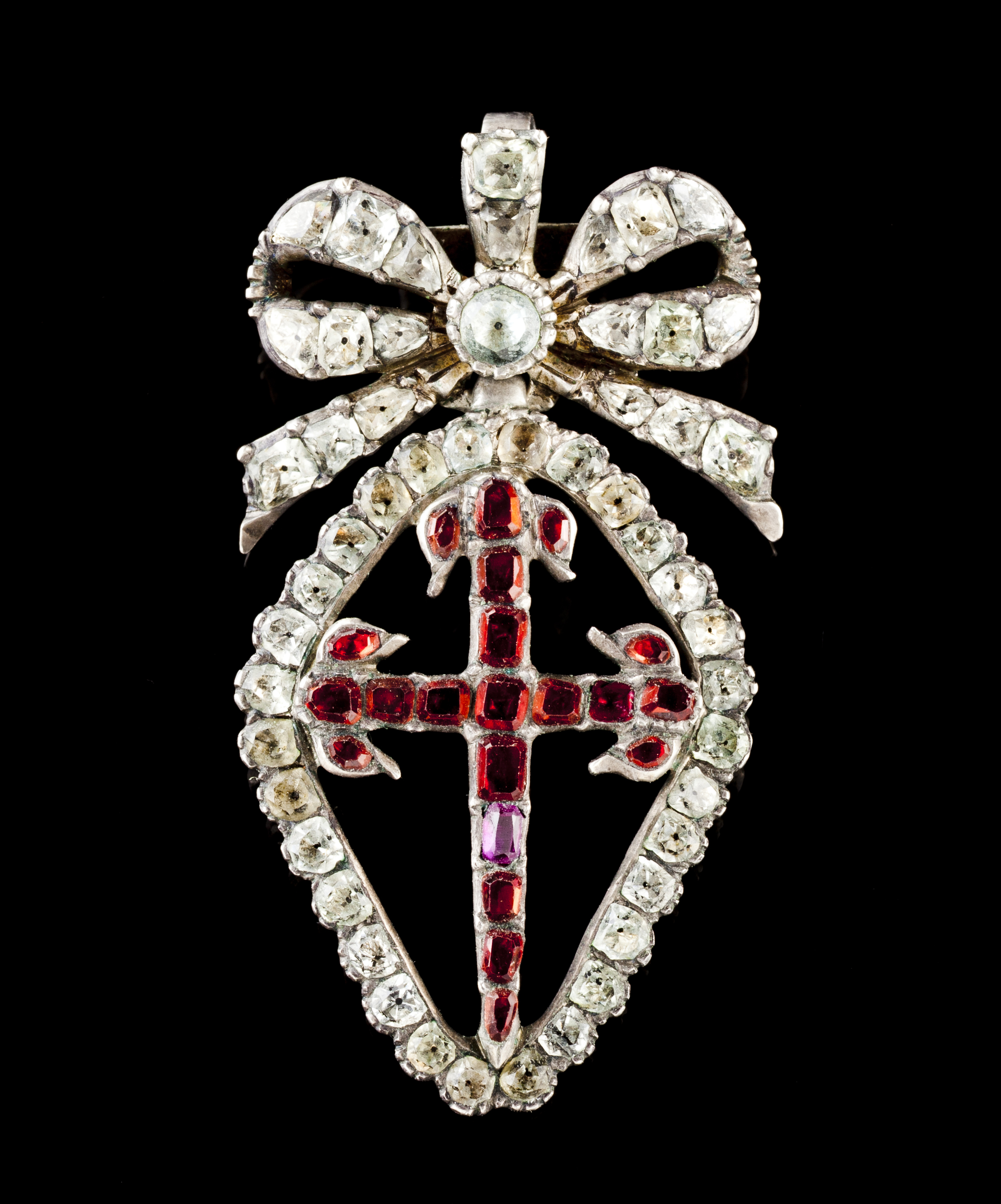 Cruz encimada por laço com fita cravejada com minas novas e granadas