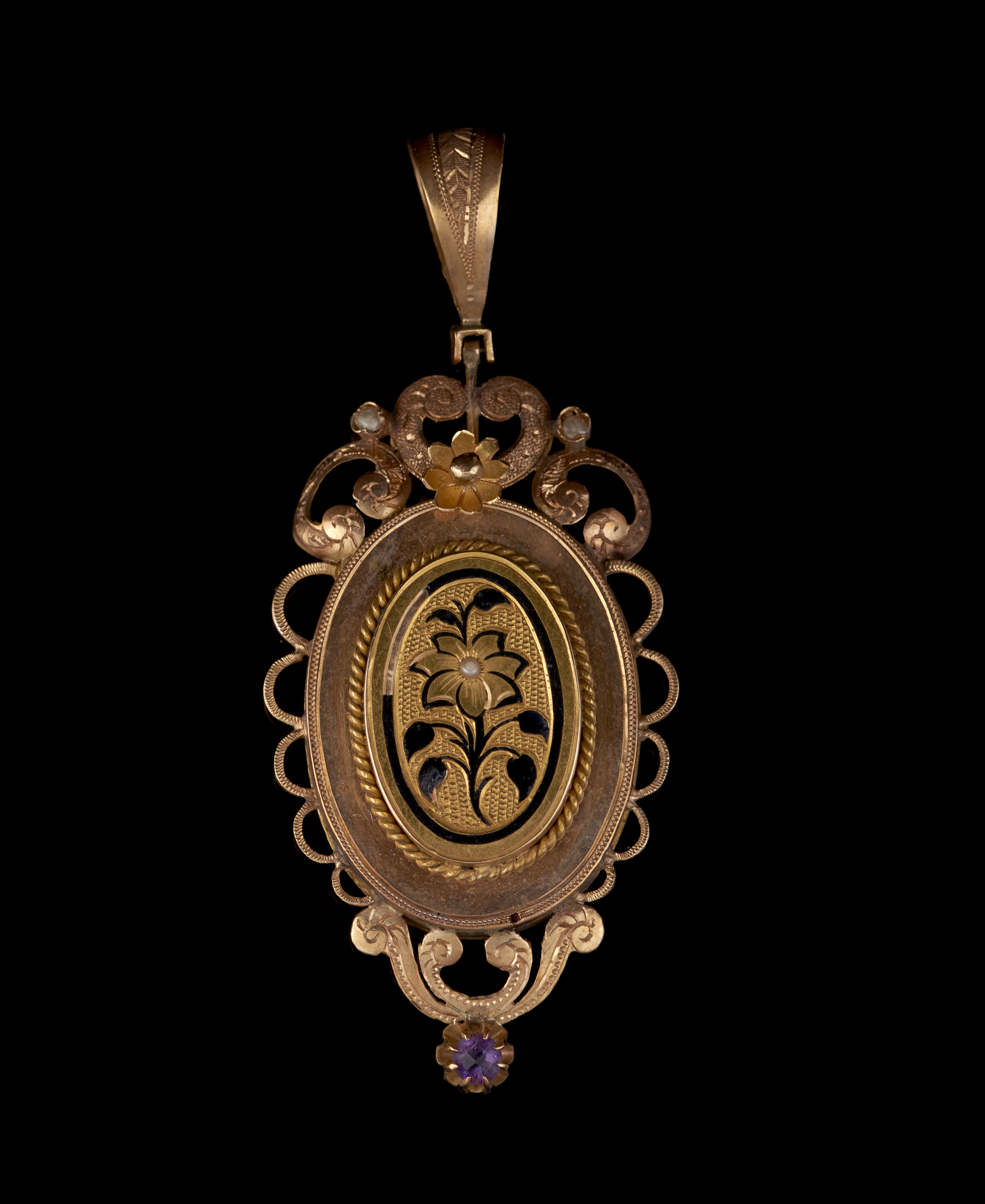 Decorado com esmaltes e cravejado com meias pérolas