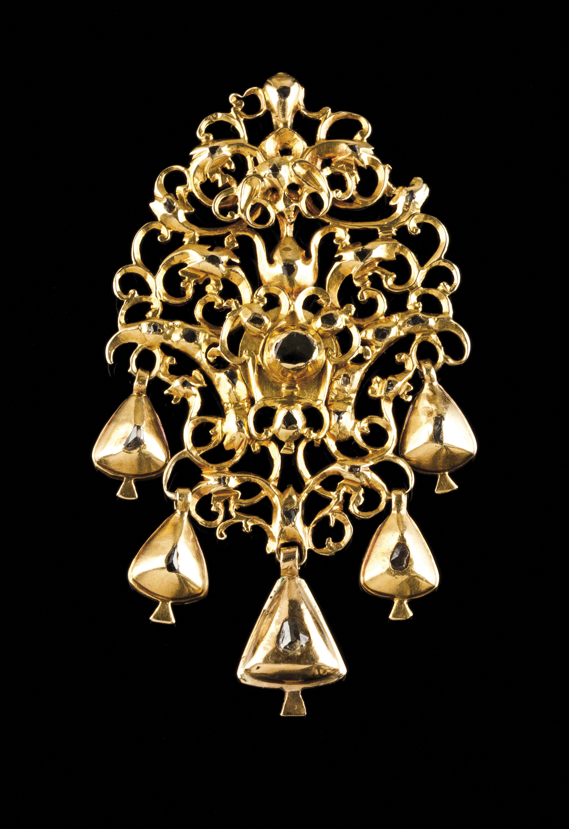Decoração vegetalista com enrolamentos e pingentes cravejados com diamantes em talhe de rosa coroada