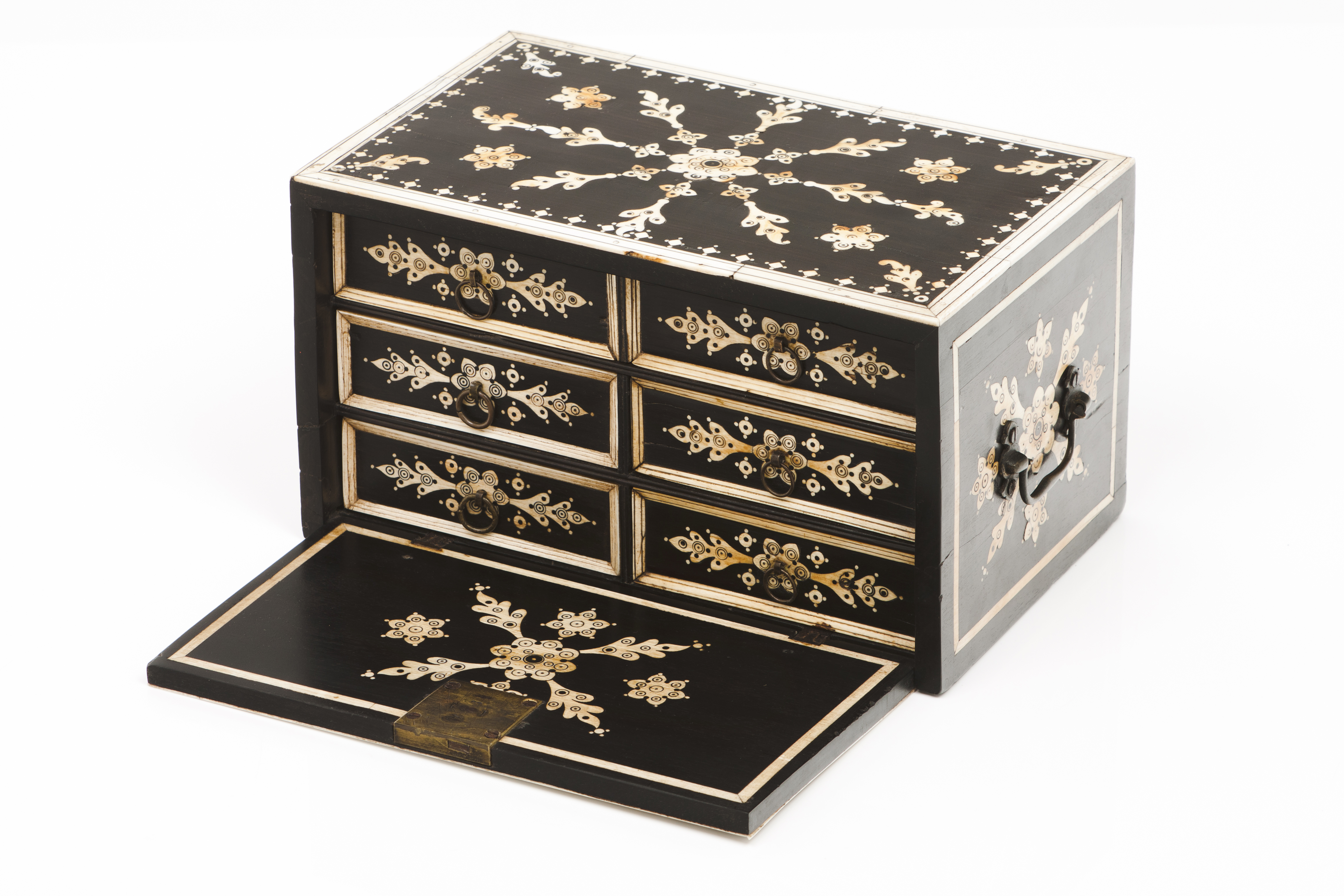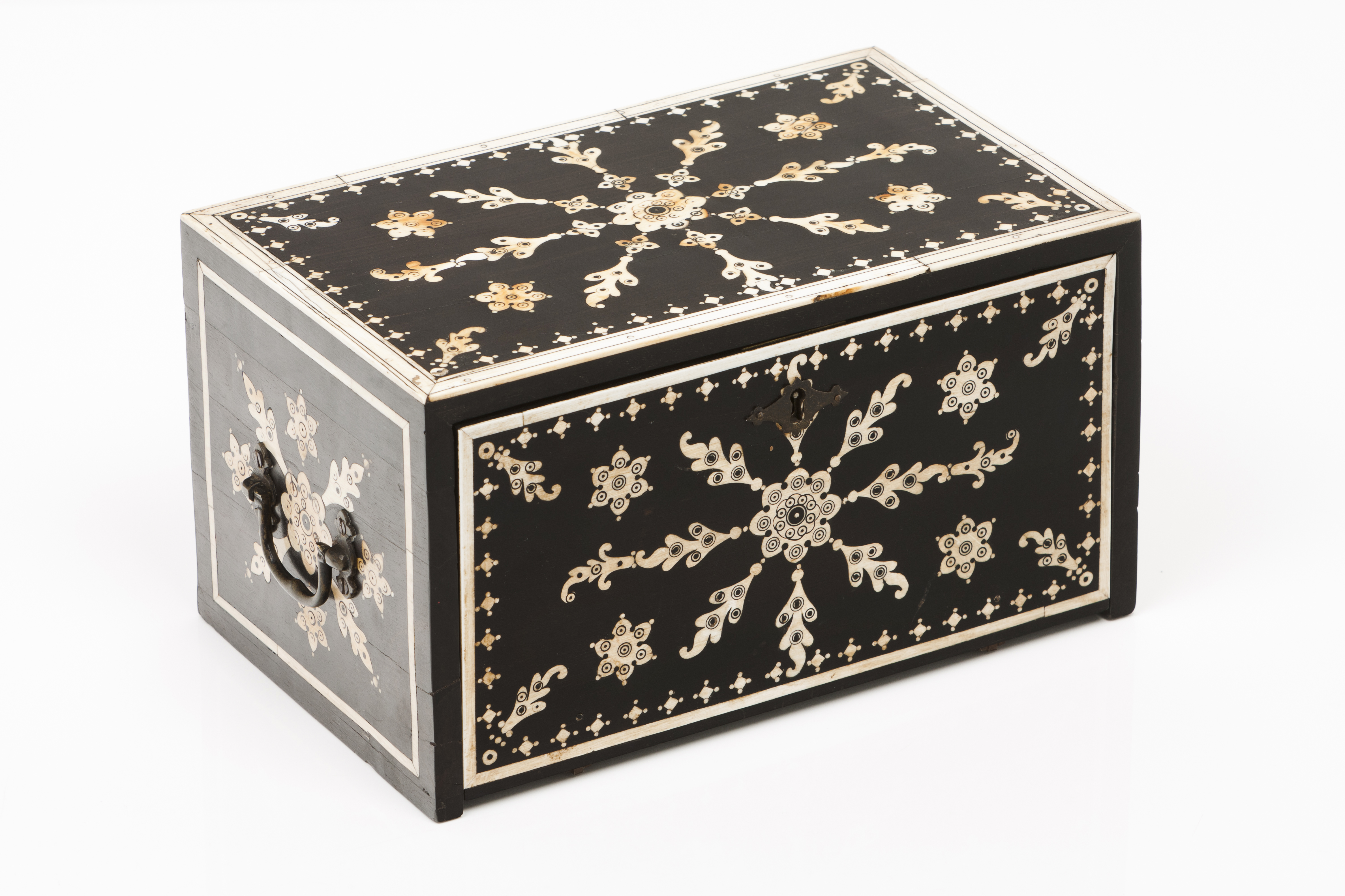 Decoração embutida em marfim representando motivos vegetalistas e geométricos