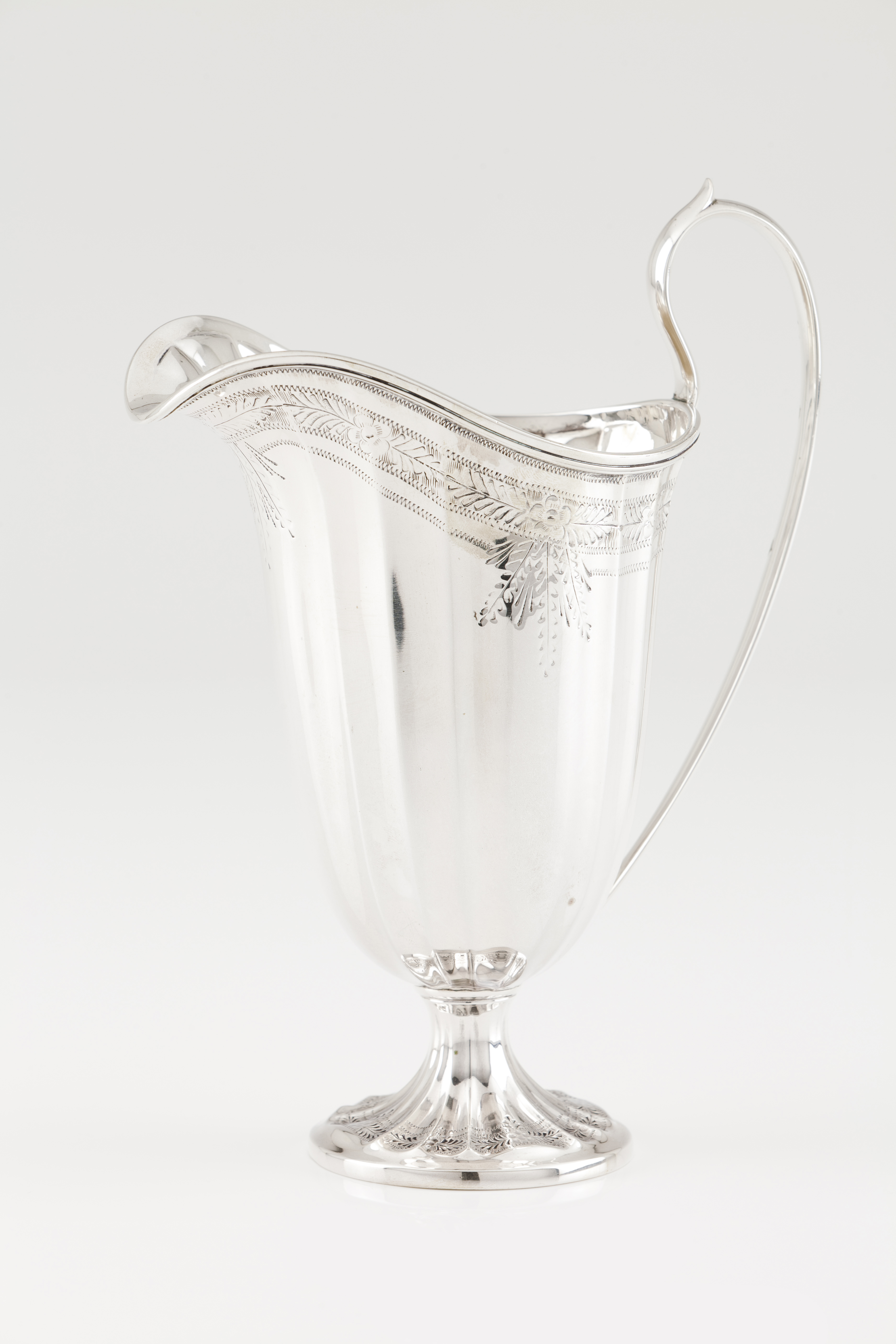 Corpo gomado, boca recortada e decorada com faixa cinzelada de motivos florais e asa lisa em voluta