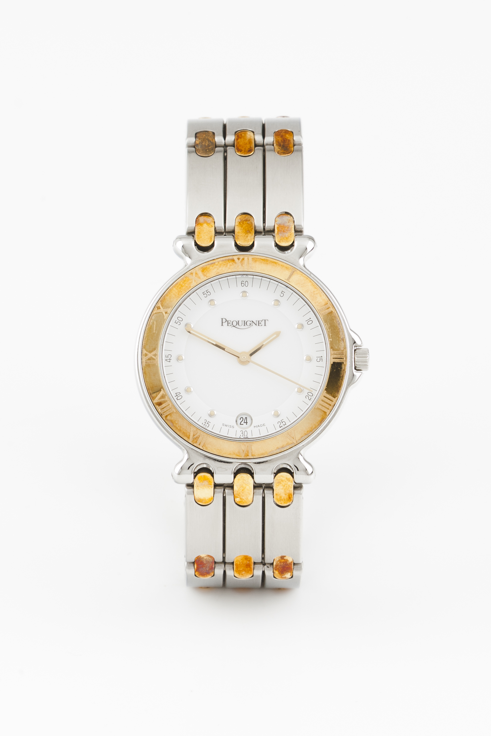 Relógio marca Pequignet. Movimento de quartzo, com data ás 6h. Caixa e bracelete em aço e ouro. Bom estado de conservação. Acompanha caixa, documentos e elos da bracelete.