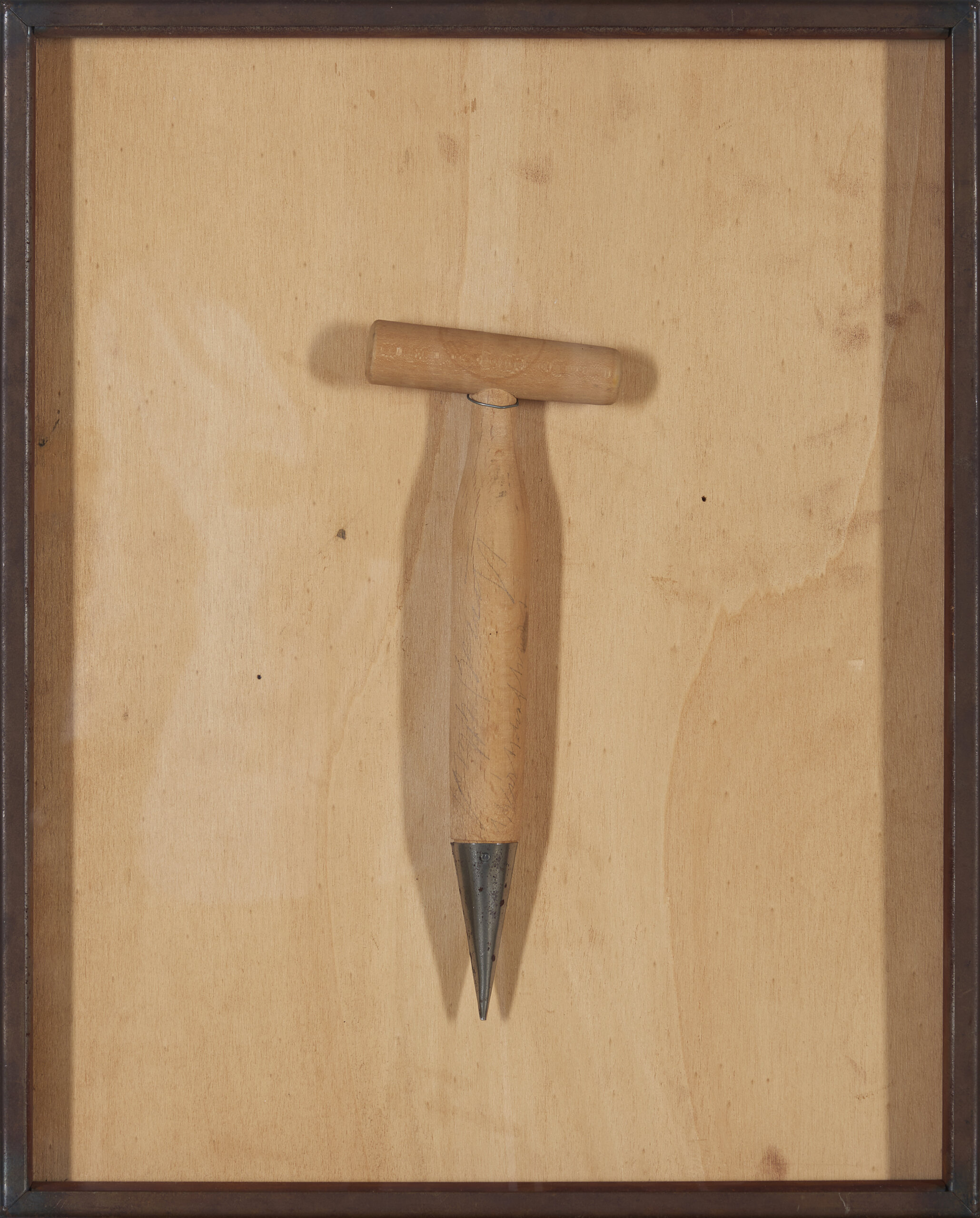 Semeador em madeira com ponta em metal montado sobre painel de madeira